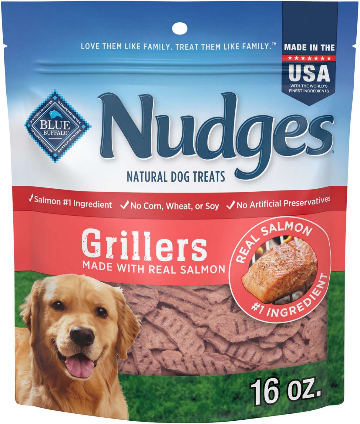 Give your dog the taste of real salmon with BLUE Nudges Grillers Natural Dog Treats. Made with real salmon as the first ingredient, these treats for dogs have a tender texture and are easy to tear into smaller pieces. They're great for dogs of all breed sizes and ages. And like all Blue Buffalo dog treats, these treats for dogs never contain chicken (or poultry) by-product meals, corn, wheat, soy, artificial flavors, or preservatives. Watch their tail wag when you reward them with BLUE Nudges Grillers Salmon Dog Treats.
