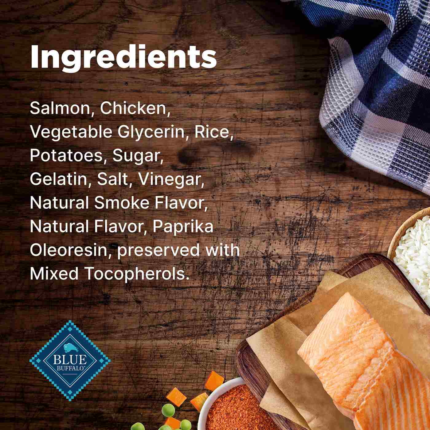 Salmon, Chicken, Vegetable Glycerin, Rice, Potatoes, Sugar, Gelatin, Salt, Vinegar, Natural Smoke Flavor, Natural Flavor, Paprika Oleoresin, preserved with Mixed Tocopherols. This product may naturally change color after opening.Allergens and safety warnings