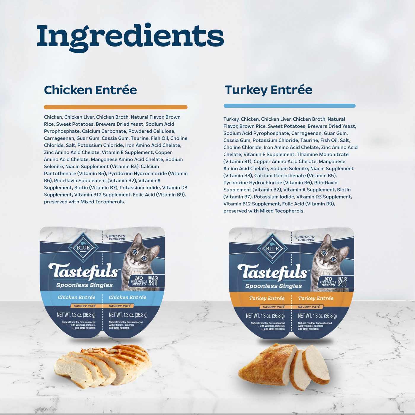 Turkey Entree Savory Pate Nutrients: Crude Protein min 10.0 %; Crude Fat min 6.0 %; Crude Fiber max 2.0 %; Moisture max 78.0 %; Taurine min 0.10 %. Chicken Entree Savory Pate Nutrients: Crude Protein min 10.0 %; Crude Fat min 6.0 %; Crude Fiber min 2.0 %; Moisture max 78.0 %; Taurine min 0.10 %.Allergens and safety warnings