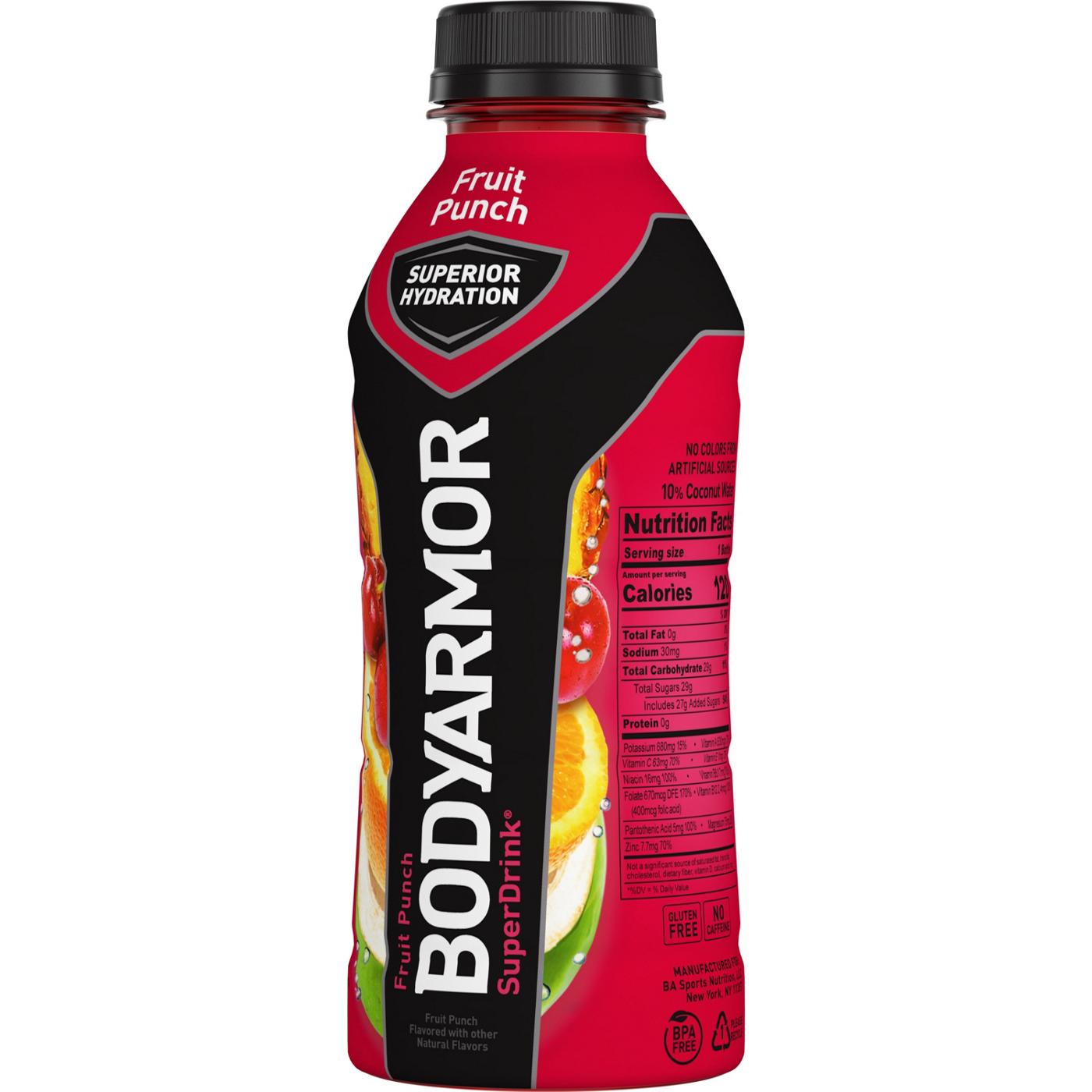 BODYARMOR Sports Drink Fruit Punch isn't just any electrolyte drink; it's made with potassium-packed electrolytes and antioxidants. It's the real hydration you need to face any challenge. No artificial sweeteners, flavors or dyes, just real hydration and a burst of delicious flavor.From pre-workout on, this hydrating sports drink is designed to help you take on your day. It's not just about quenching your thirst — it's about supporting you with every gulp. BODYARMOR Sports Drinks are made with coconut water to boost flavor, making sure you stay refreshed and ready to crush your next challenge. This is the sports drink to help you achieve your goals.If you're serious about your performance and need a sports drink beverage that works as hard as you do, reach for BODYARMOR Sports Drink Fruit Punch. It's the ultimate sports drink for athletes who demand the best from themselves.