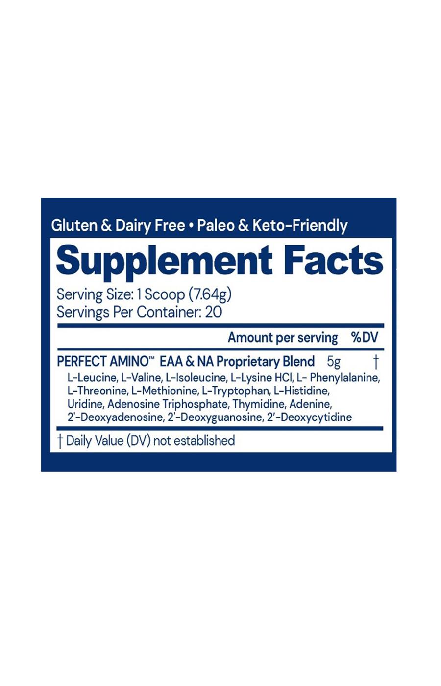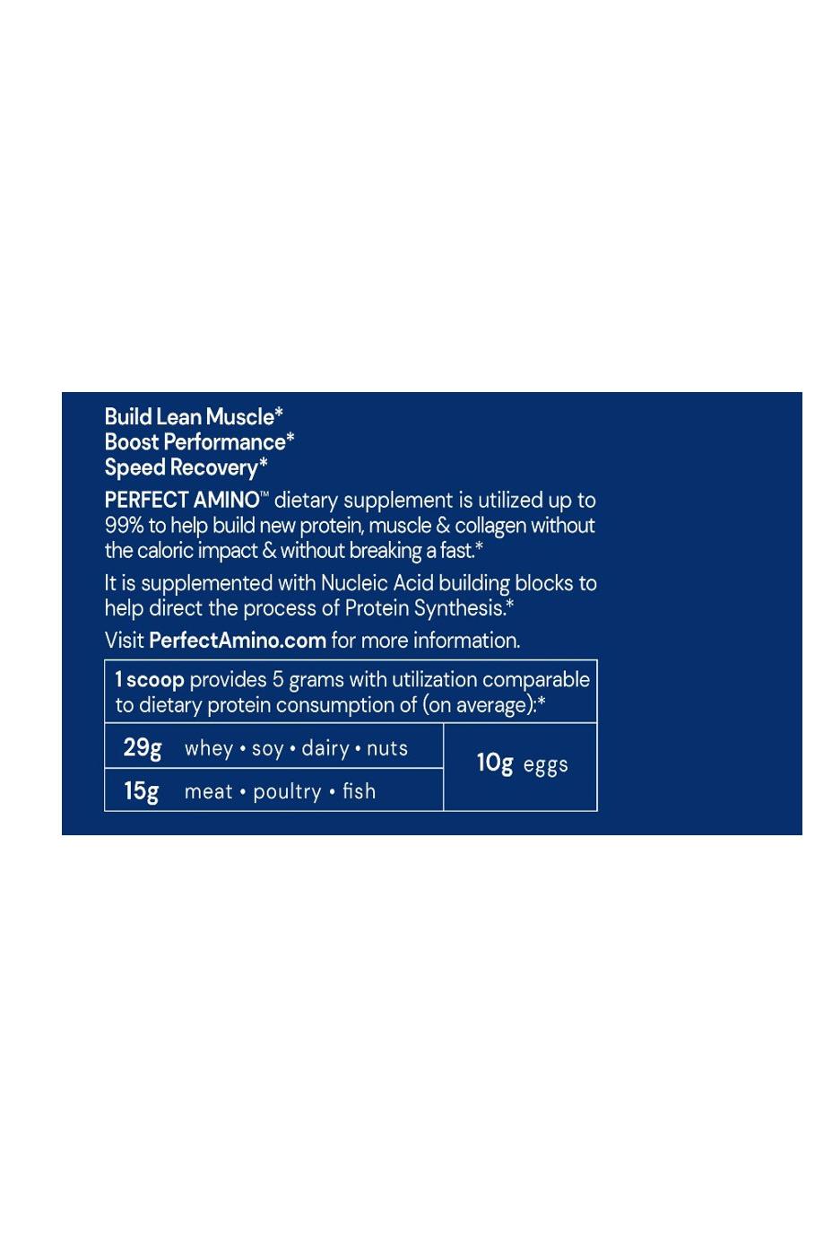 BODYHEALTH PERFECT AMINO is composed of pure essential amino acids (the building blocks of protein) in a form and ratio that's up to 99% utilized but without the caloric impact and without breaking a fast. It's further enhanced with Nucleic Acid building blocks, the foundations of our DNA and RNA, helping to direct the process of protein synthesis at the genetic level and support genetic health and performance. Plus, it's absorbed in approximately 23 - 30 minutes.