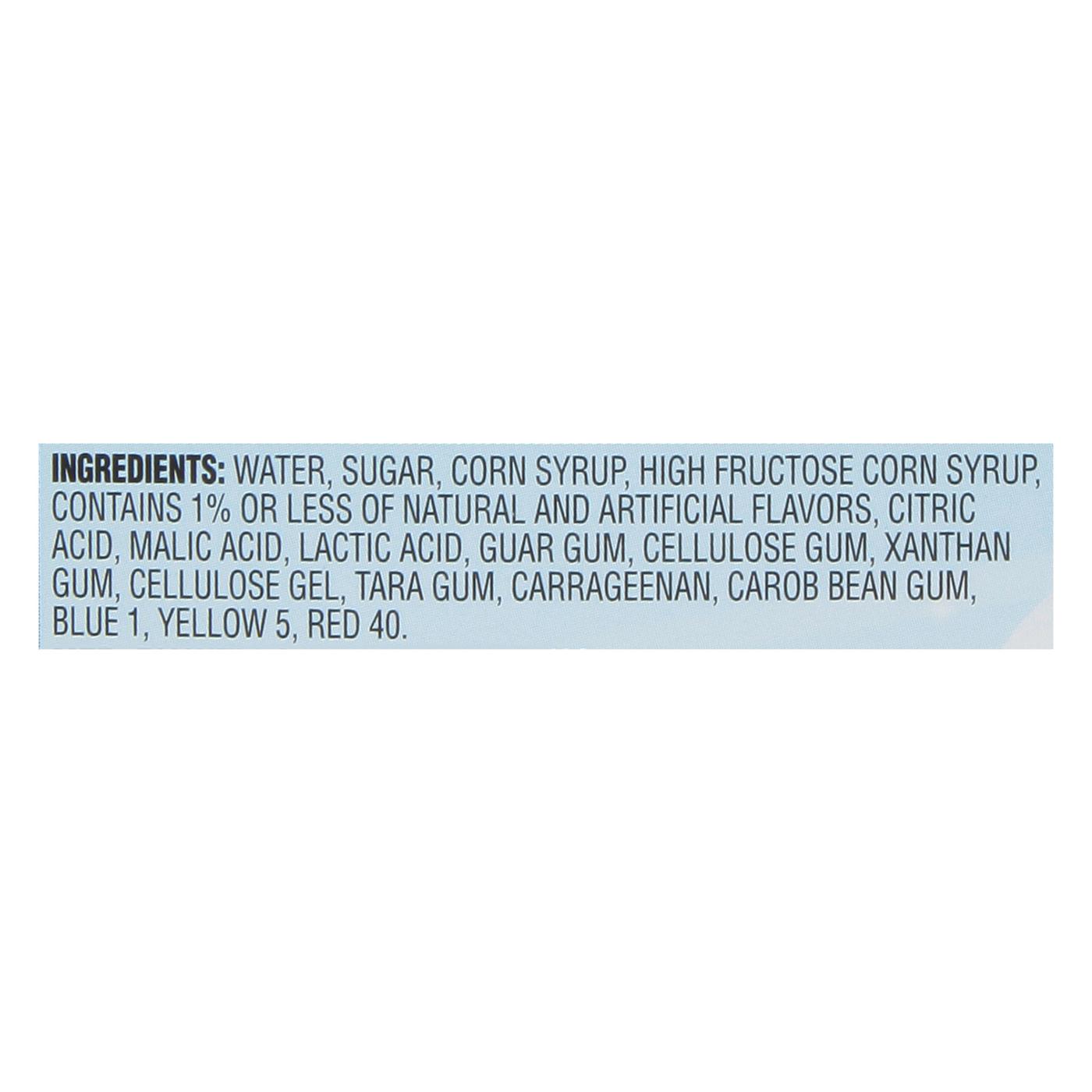 Water, Sugar, Corn Syrup, High Fructose Corn Syrup, Contains 1% or Less of Natural and Artificial Flavors, Citric Acid, Malic Acid, Lactic Acid, Guar Gum, Cellulose Gum, Xanthan Gum, Cellulose Gel, Tara Gum, Carrageenan, Carob Bean Gum, Blue 1, Yellow 5, Red 40.Allergens and safety warnings