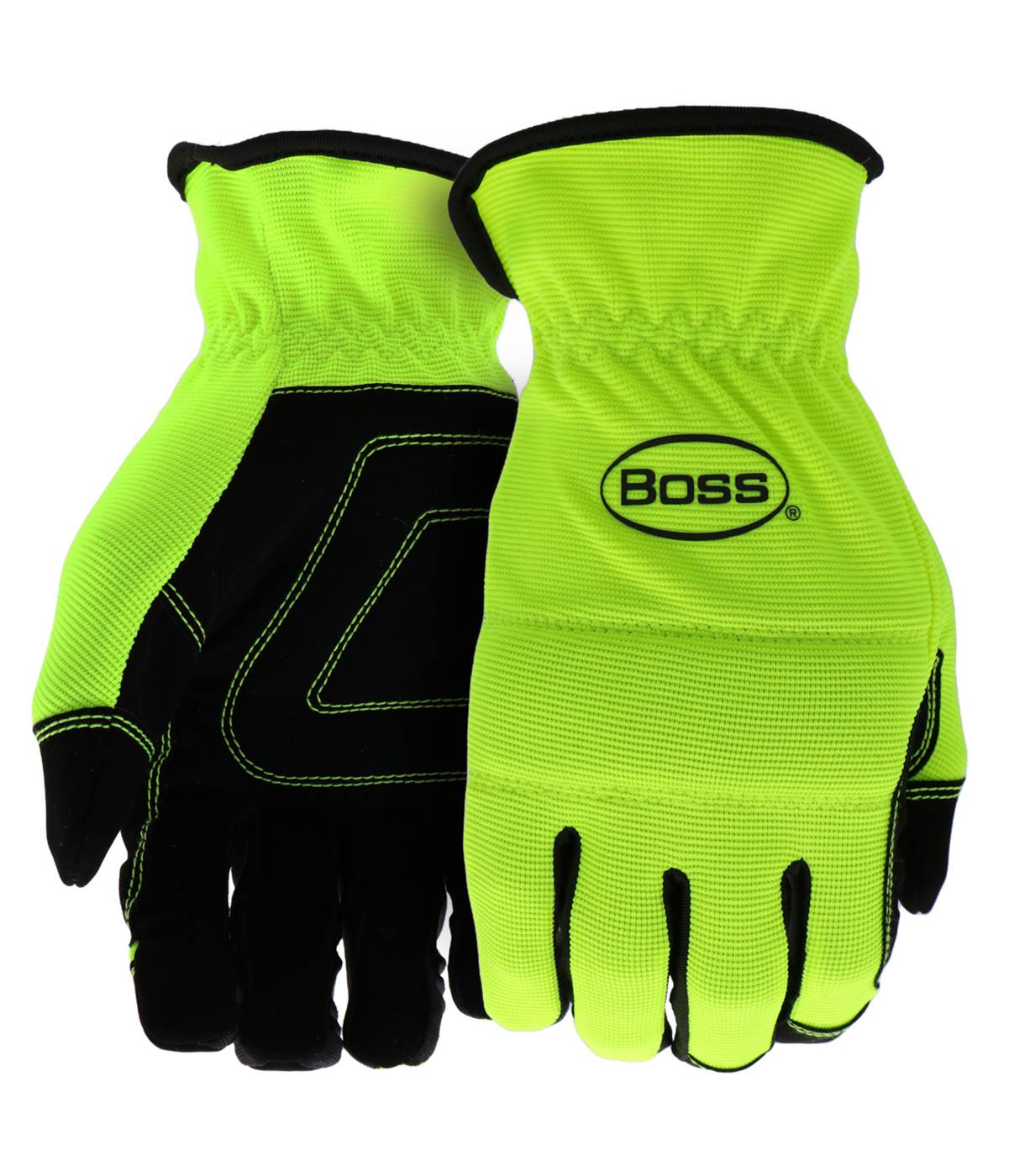 The Boss High Performance Task High Visibility gloves offer excellent protection and comfort for all of your everyday needs. The high visibility yellow coloring improves overall visibility in low or poor lighting conditions for added safety. They are designed with a synthetic leather padded palm which absorbs impact to help alleviate hand fatigue. It also offers excellent abrasion resistance to keep you protected from unwanted cuts and scrapes. The padded knuckle offers back of hand protection and adds durability to a high wear area. These gloves are designed with a breathable 4-way stretch spandex backing that ensures high dexterity while keeping you cool and comfortable. The slip-on cuff allows for easy on and off access while increasing your overall mobility.