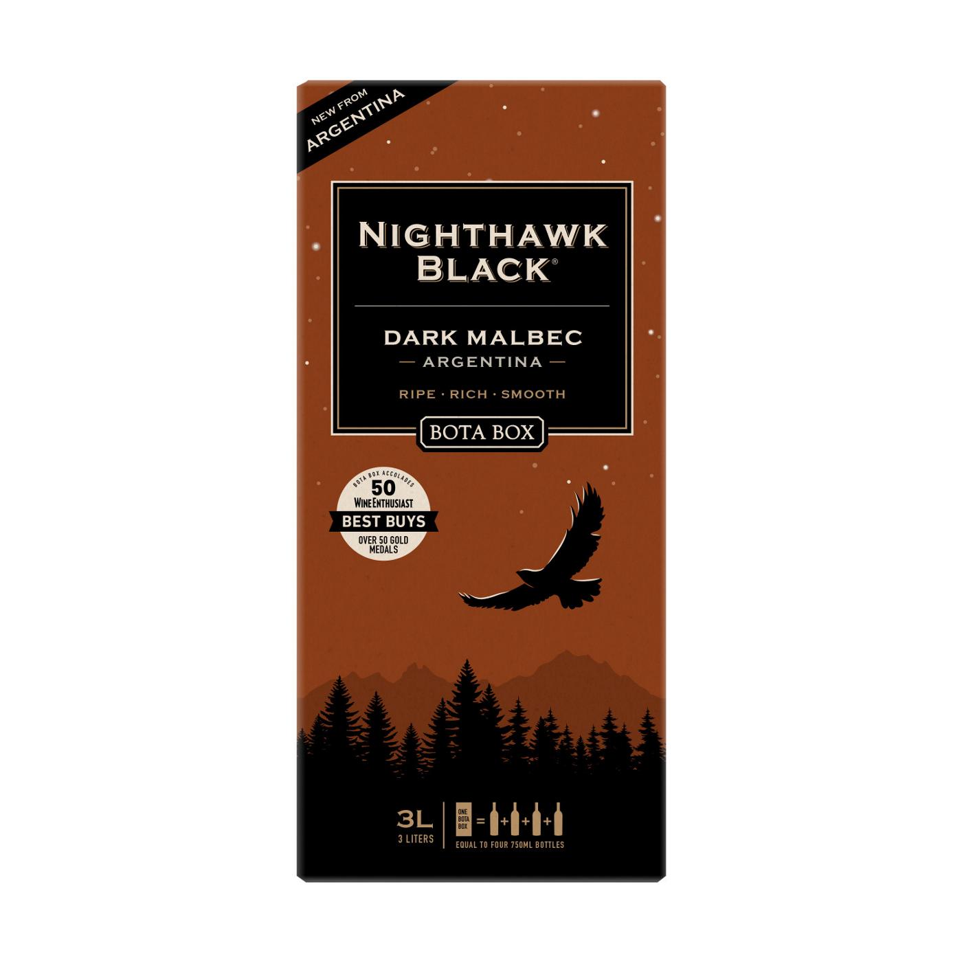 Flavor soars with Nighthawk Black wines by Bota Box. Packaged using sustainable materials and a resealable spout that keeps light and air out, you can enjoy our award-winning quality wines anywhere, anytime for up to 30 days after opening. Celebrate bolder, richer expressions of your favorite red wines, backed by the renowned quality, taste, value, and eco-friendly packaging of Bota Box. • Each 3 Liter Nighthawk Black by Bota Box contains 4 bottles of Dark Malbec wine, 14.5% ABV• Award-winning, high-quality wines• Ripe aromas of blueberry and blackberry lead to the soft flavors of blueberry pie, cedar, and spice• Rich, jammy red wine pairs with skirt steaks, loaded burritos, and spicy grilled sausage• Boxes block out light and air to keep wine fresh for up to one month after opening and are 100% recyclable boxes made from more than 90% post-consumer fiber