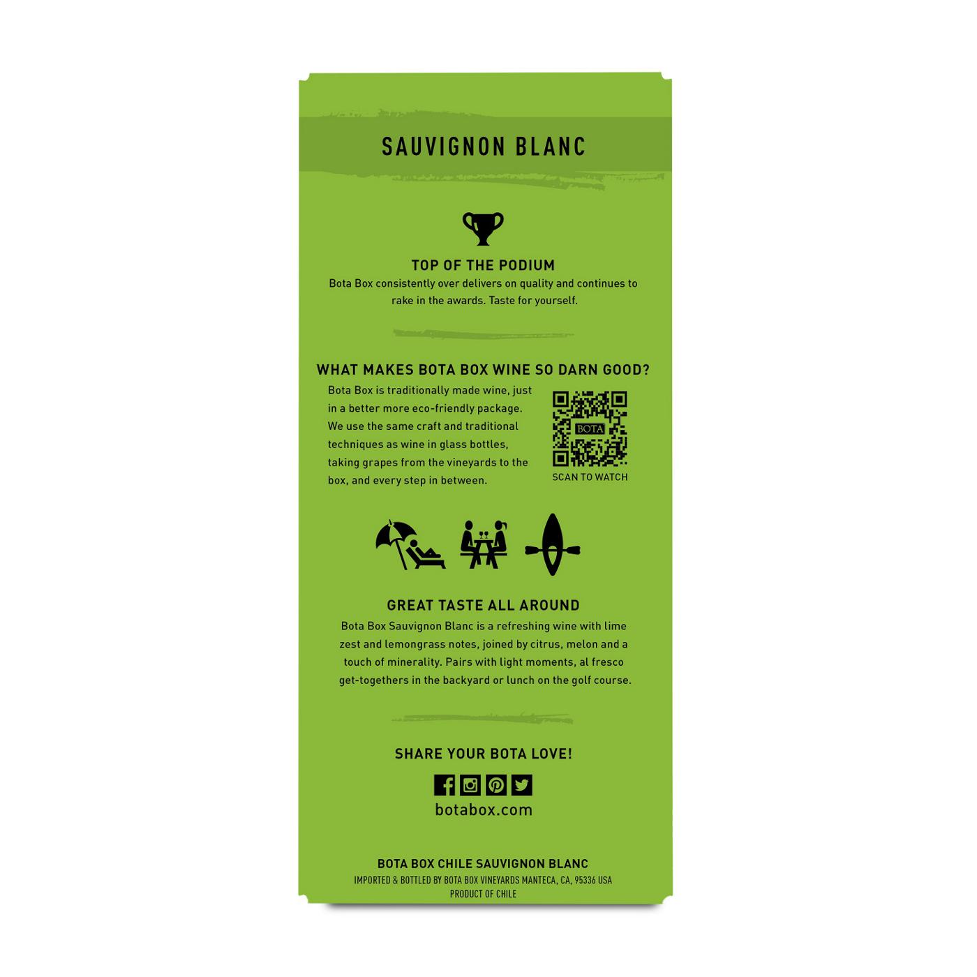 Living the Bota life means great times with best friends over good wine. It’s about leaving expectations behind and going with the flow—wherever life takes you next. Our award-winning wine uses sustainable materials & the three-liter box and spout keep light and air out, so you can enjoy quality wines anywhere, anytime for up to 30 days after opening. Our Bota Box Sauvignon Blanc speaks to dining al fresco at a backyard bar-b-que or lunch on the golf course. What could be more refreshing than lime zest and lemon grass? With a zip of citrus, melon and a touch of minerality. Pairs perfectly with grilled chicken skewers and salad with goat cheese and vinaigrette, and all of life’s adventures. • Bota Box Sauvignon Blanc White Wine, 3L (4 750ml bottles), 12.5% ABV• Award-winning, high-quality wines• Each 3 Liter Bota Box contains 4 bottles of Sauvignon Blanc wine• Refreshing aromas of lime zest and lemongrass precede flavors of citrus, melon, and a touch of minerality• Boxes block out light and air to keep wine fresh for up to one month after opening and are 100% recyclable and made from more than 90% post-consumer fiber