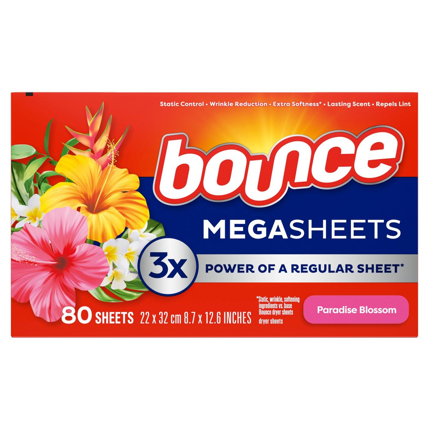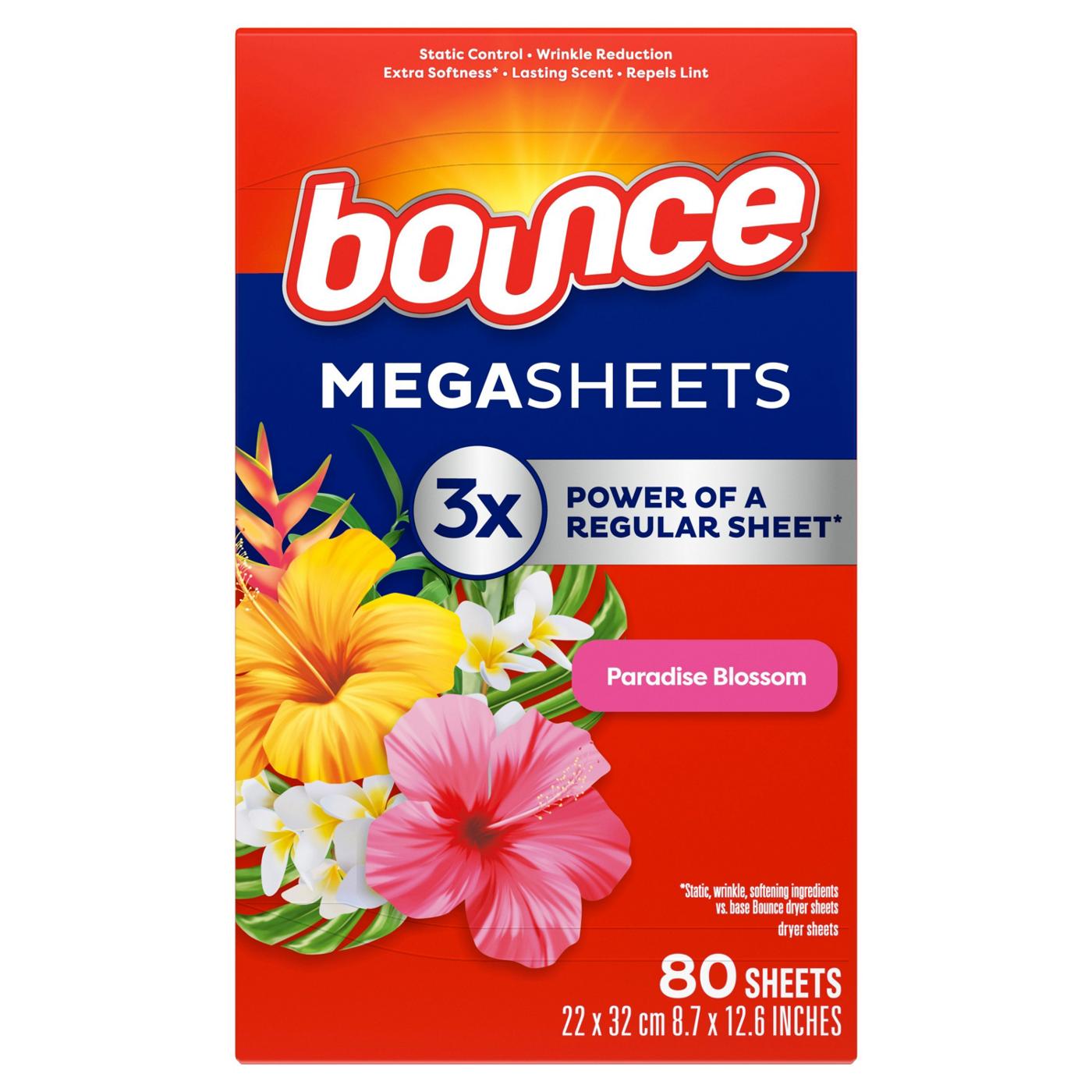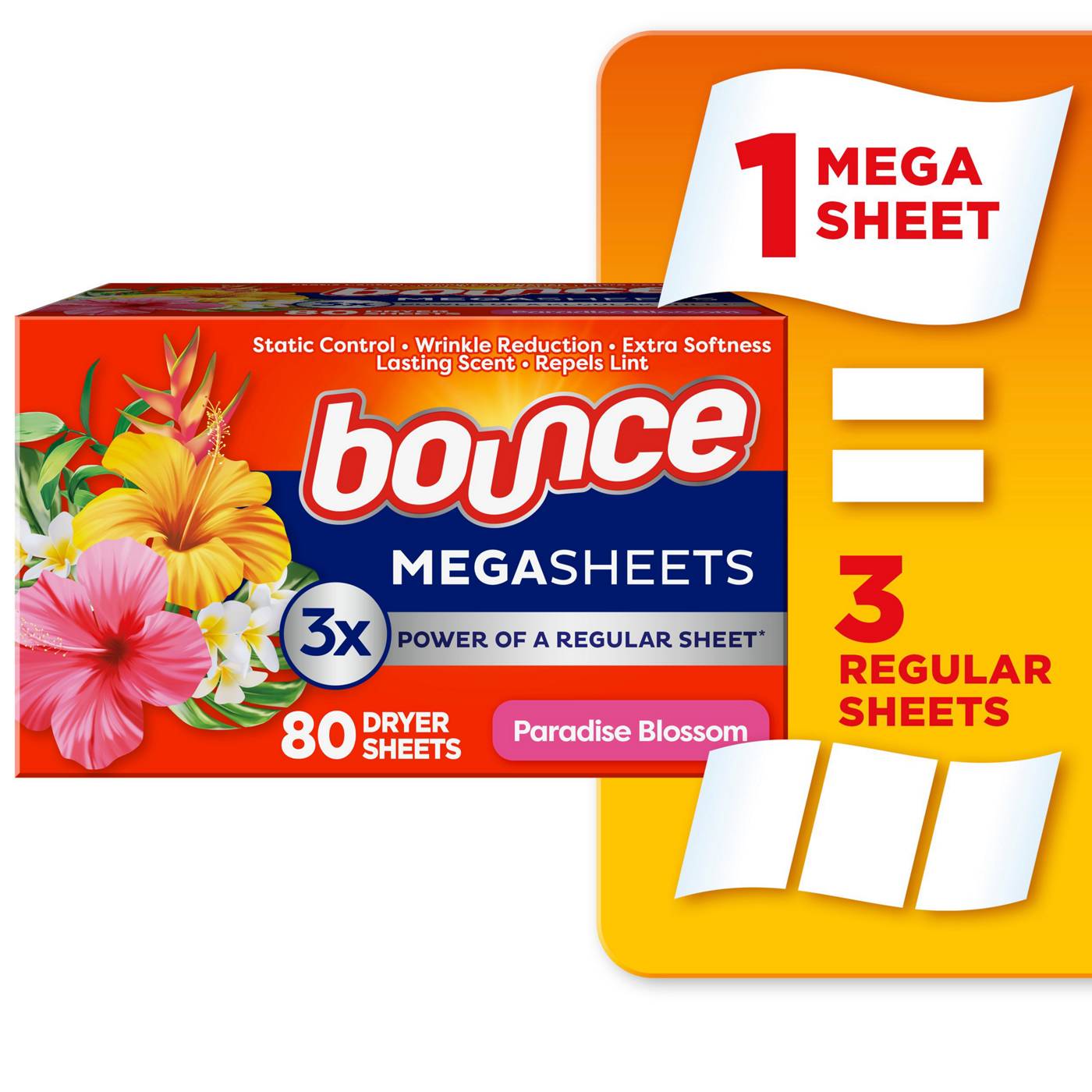 One dryer sheet is all you need when you use Bounce Paradise Blossom Mega Dryer Sheets. With 5-in-1 benefits, including static control, wrinkle reduction, extra softness, lasting scent, and lint fighting, you get everything you want all from a single sheet. Bounce Mega Sheets equals the power of three regular sheets, meaning you use less every load. Just toss one and you're done! Get laundry that comes out less clingy with 3X more static-fighting ingredients compared to regular sheets.* Enjoy the scent of a paradise blossom that smells great from the dryer and lasts until you pull it from your drawer. Just toss it in the dryer to Bounce out wrinkles and static all while adding long lasting freshness and extra softness!*vs. Bounce Base dryer sheets