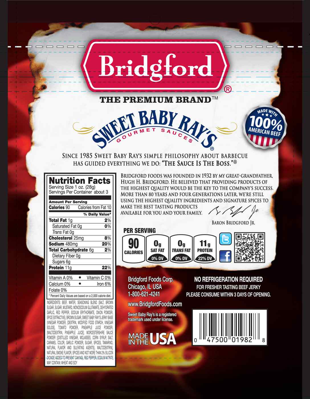Bridgford Beef Jerky is made from the finest quality cuts of beef with our signature blend of spices to give it that distinct rich flavor that our customers have enjoyed for years. Winner of the 2008 Men’s Health Nutrition Award, this carb-conscious snack is just the thing to satisfy your taste buds. Take this snack anywhere, it’s the perfect choice for a busy lifestyle!