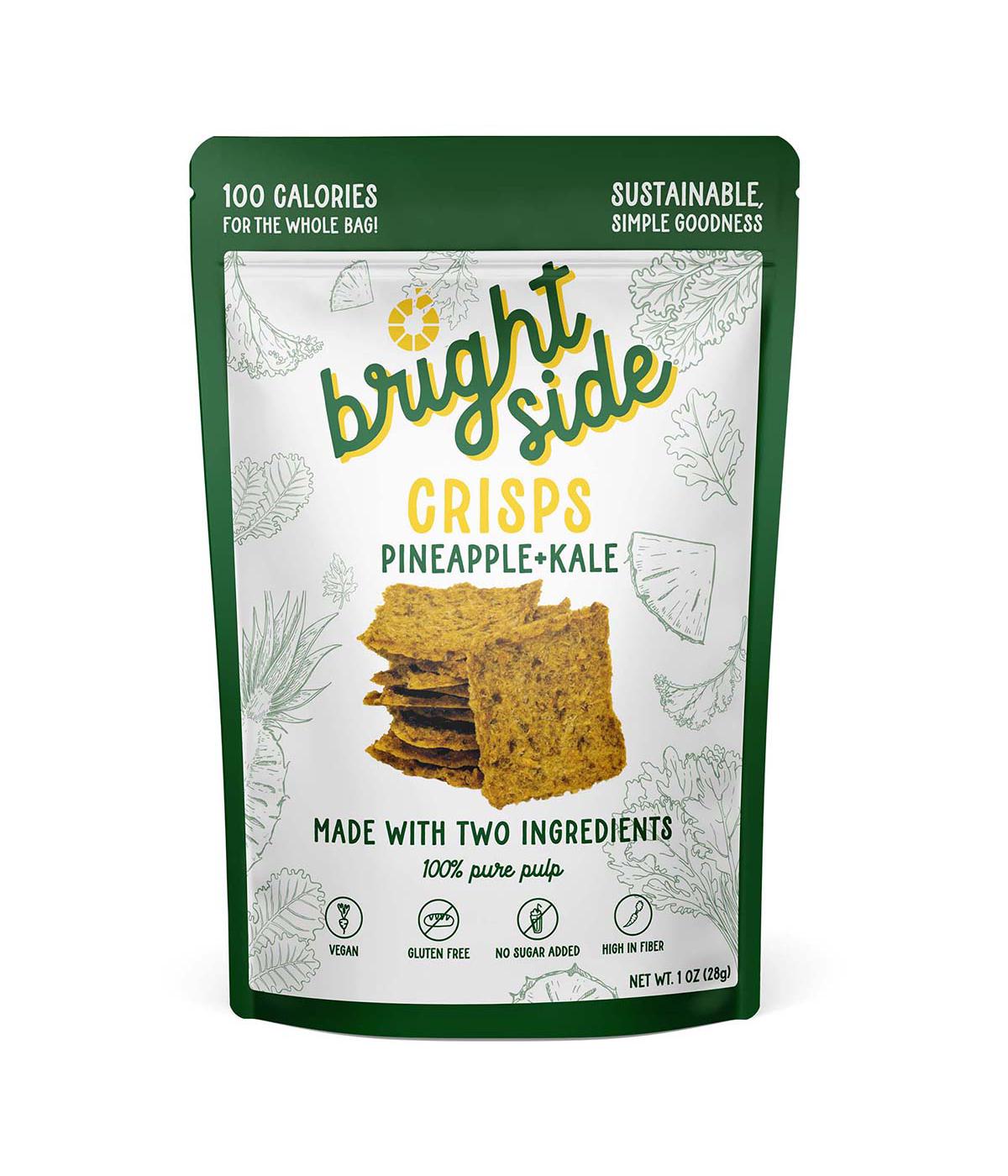 Pineapple + Kale Pulp Crisps mix tangy pineapple with nutrient-rich kale for a savory, wholesome snack. Made from two sustainable, all-natural ingredients, these crisps are a guilt-free alternative to chips, crackers, and dried fruit. With fiber and calcium in every bite, they’re as nutritious as they are delicious. Great for dipping, spreading, charcuterie boards, lunch boxes, or snacking on the go, these vegan, gluten-free, and Kosher crisps are a tasty treat at only 100 calories per bag!