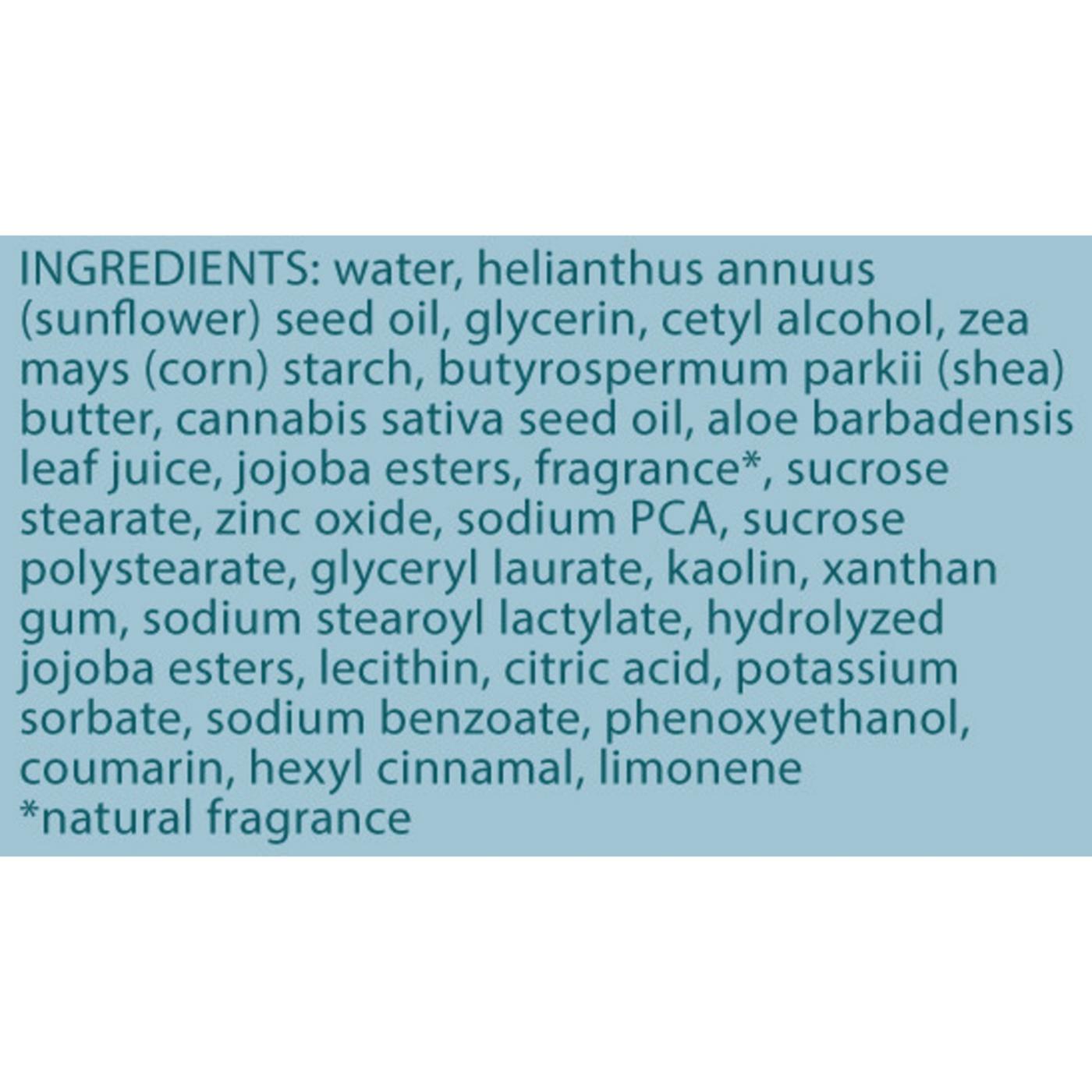 Water, Helianthus Annuus (Sunflower) Seed Oil, Glycerin, Cetyl Alcohol, Zea Mays (Corn) Starch, Butyrospermum Parkii (Shea) Butter, Cannabis Sativa Seed Oil, Aloe Barbadensis Leaf Juice, Jojoba Esters, Fragrance (Natural Fragrance), Sucrose Stearate, Zinc Oxide, Sodium PCA, Sucrose Polystearate, Glyceryl Laurate, Kaolin, Xanthan Gum, Sodium Stearoyl Lactylate, Hydrolyzed Jojoba Esters, Lecithin, Citric Acid, Potassium Sorbate, Sodium Benzoate, Phenoxyethanol, Coumarin, Hexyl Cinnamal, Limonene.