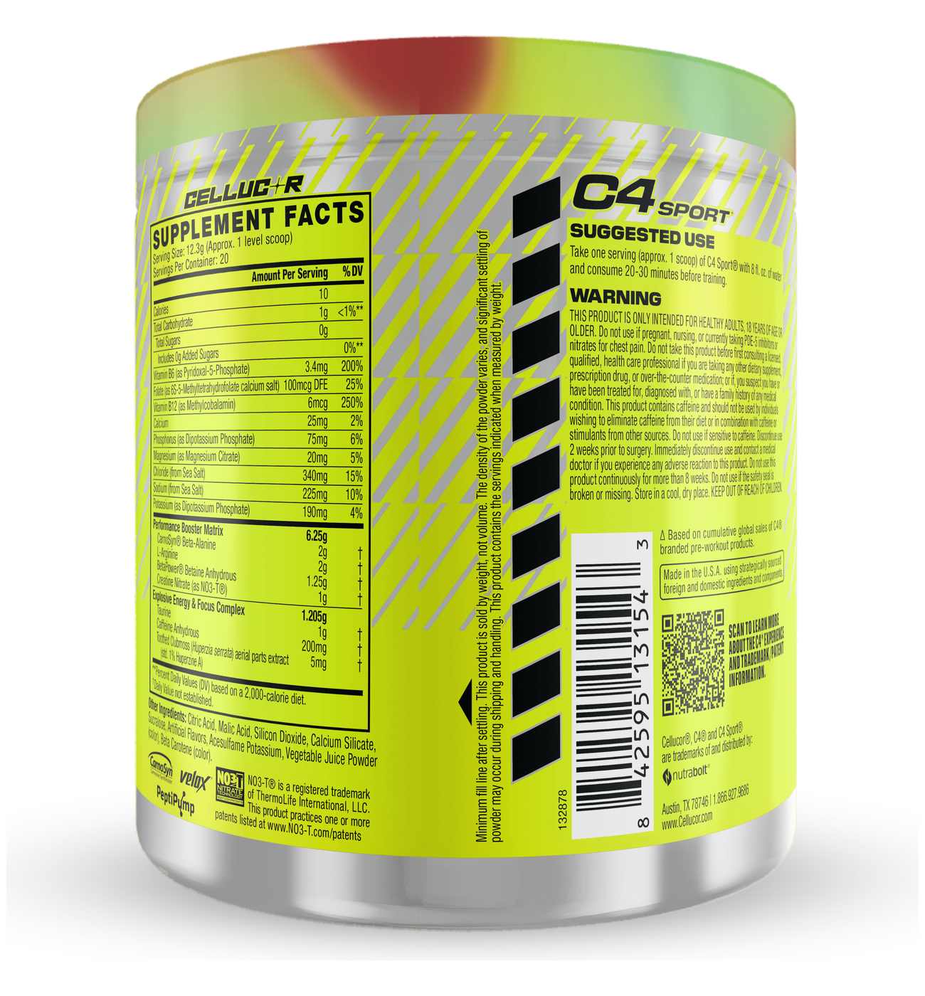 Power up your strength training with the upgraded C4 Sport pre-workout. Packed with extra active ingredients, this formula redefines high-performance muscle building, turning every workout into an explosive burst of energy and endurance.* With 200mg of caffeine and 2g of CarnoSyn® Beta-Alanine, C4 Sport propels you into a new world of workout intensity. No more missed workouts or shortened sessions – this formula provides the hard-hitting energy and endurance to elevate your training to new heights.* While fueling intense workouts, C4 Sport pre-workout also powers muscle growth. Its mighty formula crafted with Creatine, elevATP®, Leucine, Arginine, and BetaPower® Betaine to fuel heavier lifts and pack on muscle.* As the #1 Global Pre-Workout Brand‡ backed by 20 years of sports nutrition expertise, you can trust C4® to fuel your training.*These statements have not been evaluated by the Food and Drug Administration. This product is not intended to diagnose, treat, cure or prevent any disease.
