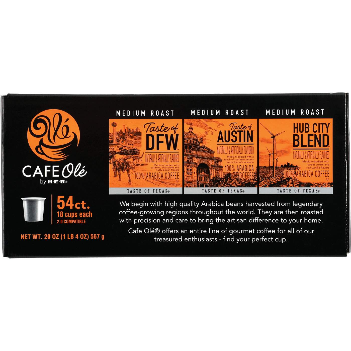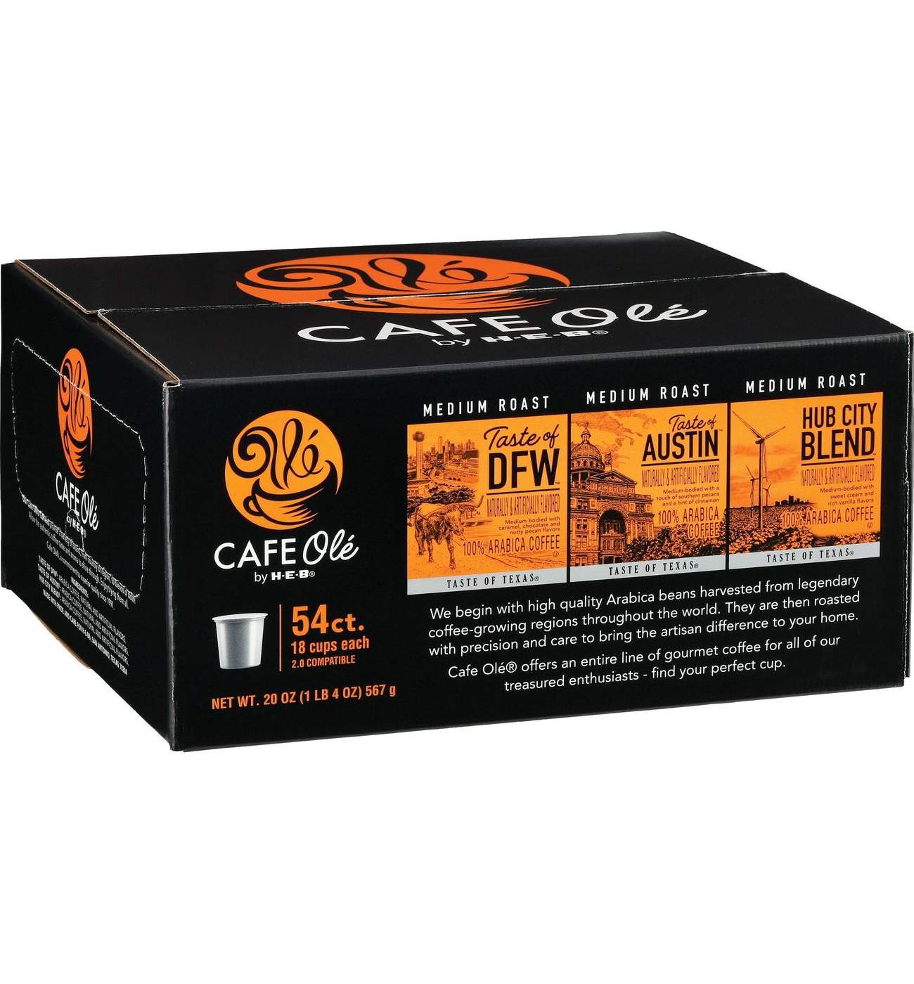 Get a taste of Texas with this variety pack of CAFE Olé by H E B medium roast coffee. Totaling 54 single serve cups in all, it's a great size for breakrooms, teachers' lounges or any coffee spot. Each 2.0 compatible pod brews one hot cup of joe. You'll get:
