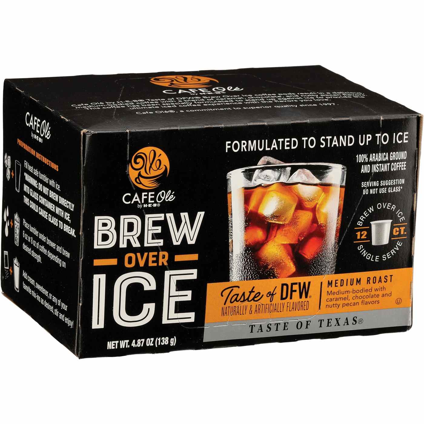 Iced coffee just got easier with CAFE Olé Brew Over Ice! No need to waste money at an expensive coffee shop when you can get quality iced coffee with the push of a button. These 2.0-compatible single serve pods stand up to ice and make your refreshing home brew better. Each caramel, chocolate, and nutty pecan-flavored pod uses 100% Arabica ground and instant medium roast coffee. It's the perfect Taste of Texas!