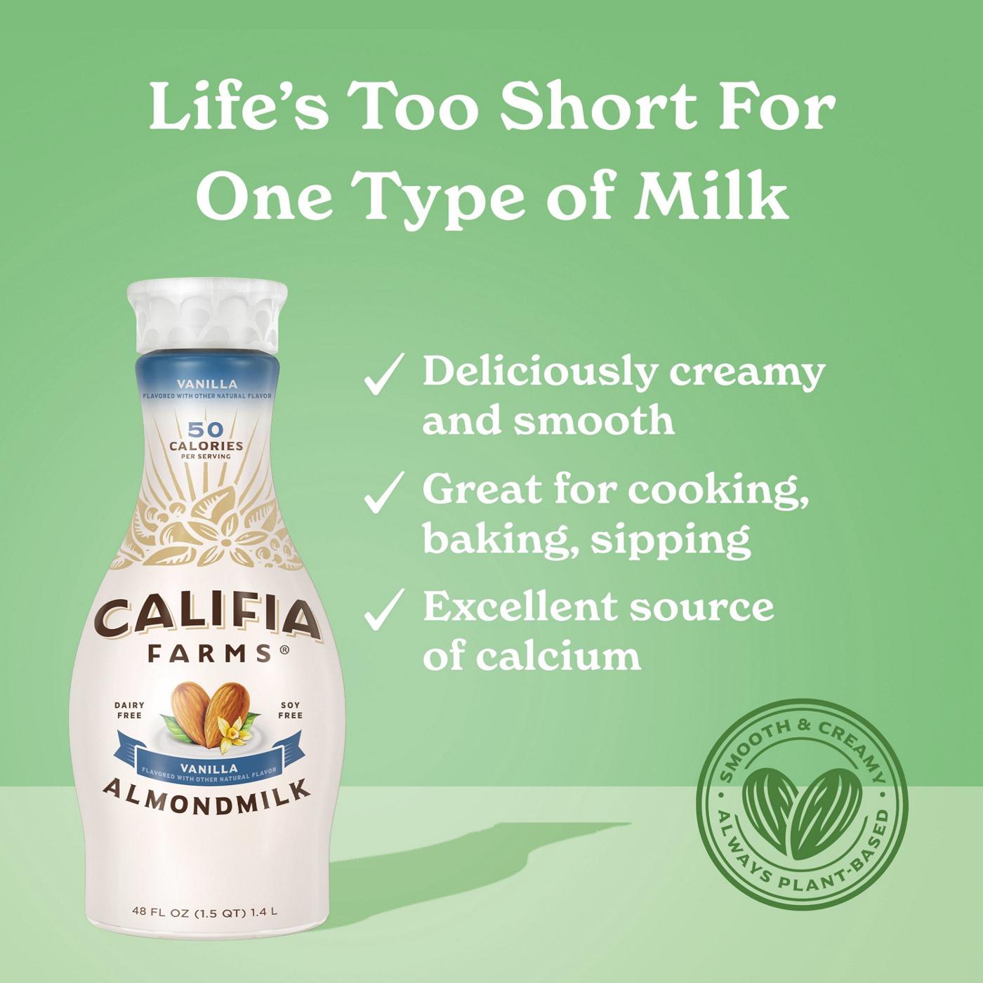 We took our signature silky-smooth and extra creamy almond milk and swirled in the luscious flavor of vanilla. Our Vanilla Almondmilk is a dairy-free plant milk so deliciously creamy you won’t believe it’s only 50 calories a serving. Pour it over your cereal, stir it into your coffee, or sip it straight from a tall cold glass. No matter how you enjoy it, the delectable vanilla flavor and creamy texture come through. And as pleasurable as Califia Farms’ Vanilla Almondmilk is to drink, it’s an absolute joy to bake with. Use it in all of your favorite sweet recipes. From cookies and cakes to pancakes and puddings, it’s a perfect fit.We make our almond milk with only simple, non-GMO-certified plant-based ingredients, accentuating the natural flavors of the highest-quality almonds. Every serving is an excellent source of calcium and totally free from soy, gluten, and carrageenan.