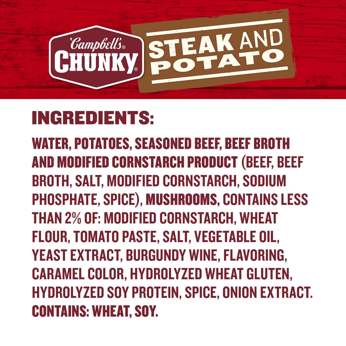 Water, Potatoes, Seasoned Beef - Beef Broth and Modified Cornstarch Product (Beef, Beef Broth, Salt, Modified Cornstarch, Sodium Phosphate, Spice), Mushrooms, Contains Less than 2% of: Modified Food Starch, Wheat Flour, Tomato Paste, Salt, Vegetable Oil, Burgundy Wine, Monosodium Glutamate, Yeast Extract, Caramel Color, Hydrolyzed Wheat Gluten, Hydrolyzed Soy Protein, Flavoring, Onion Extract.Allergens and safety warnings