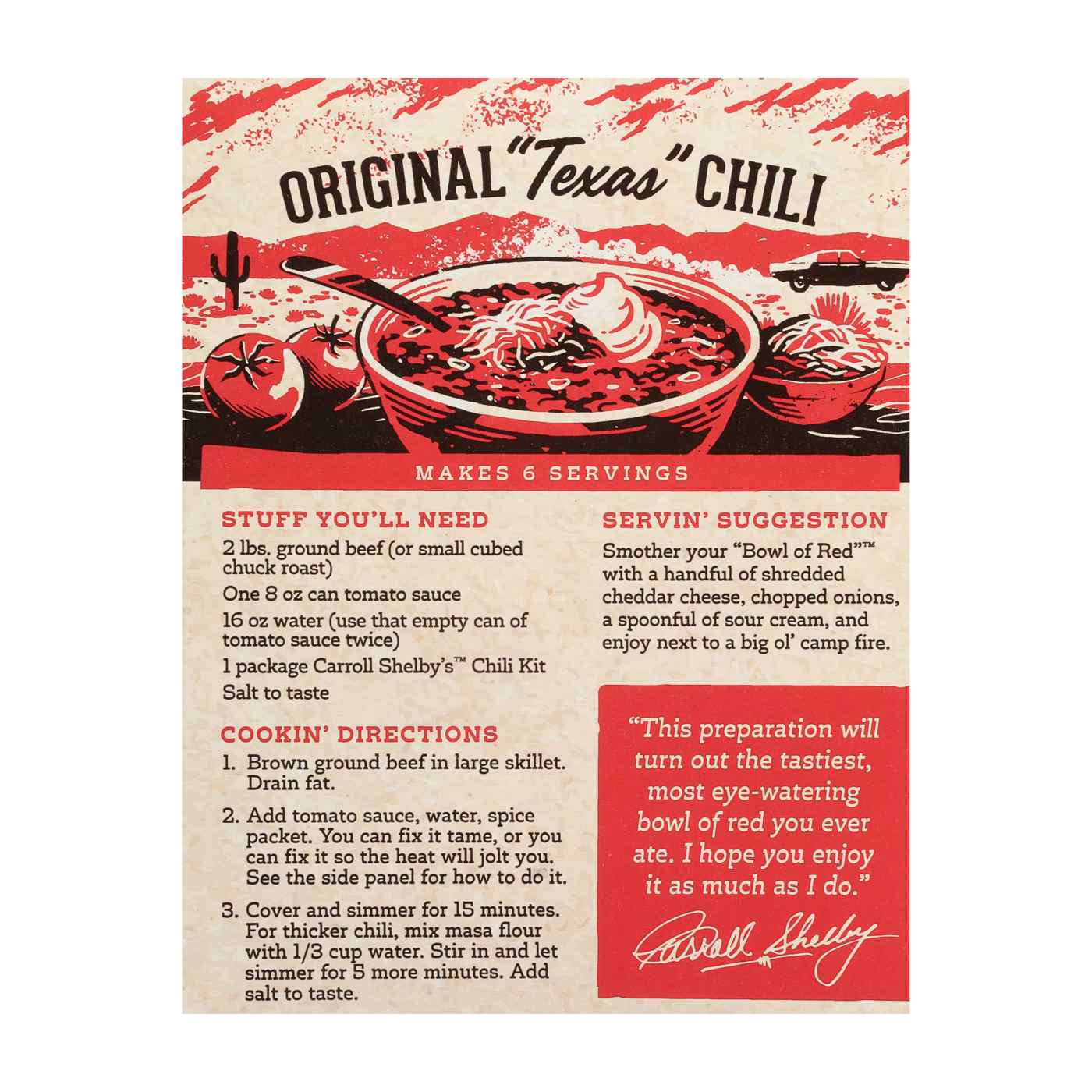 Carroll Shelby's custom chili kit features individual packets of spices, cayenne, and masa flour that let you season two pounds of meat just the way you like. Delicious on its own or atop burgers, tacos, or salads. Just add creativity and your own special fixin's.