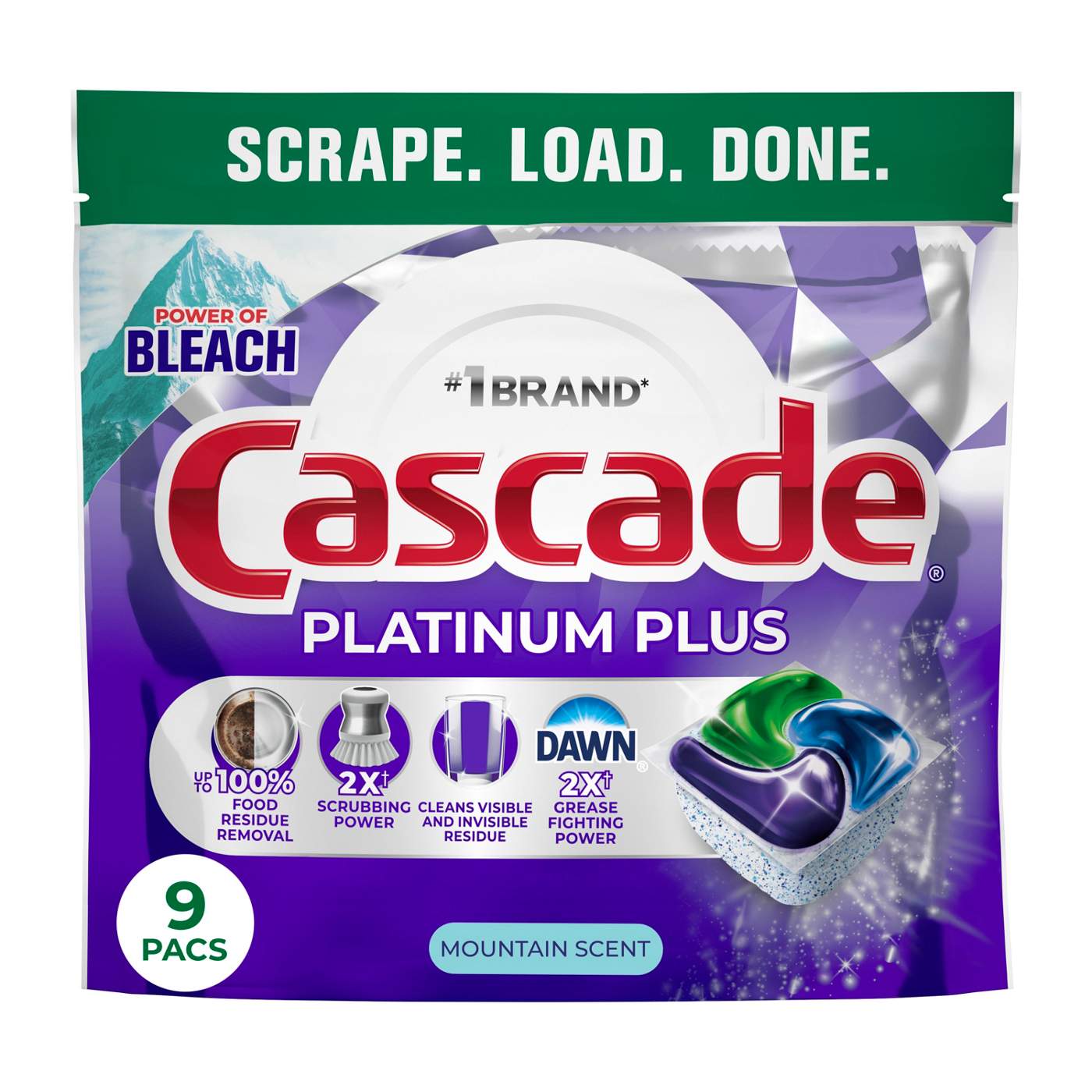 New and Improved Cascade Platinum Plus ActionPacs dishwasher detergent gives your dishes a breakthrough clean with up to 100% food residue removal. Loaded with 2X* the Dawn grease fighting power, and 2X* the tough food scrubbers, it has soaking, scrubbing, and rinsing built right in. You can skip the pre-rinse, skip the soak, skip the scrub, and dare to dish differently. Just scrape your dishes and load them into your dishwasher with Platinum Plus to get a superior, sparkling clean, saving you time, effort, and energy vs handwashing. Cascade Platinum Plus removes visible and invisible residue for gleaming glassware, dazzling dishes, and pristine pots and pans. *Cleaning ingredients vs. Cascade Complete ActionPacs.