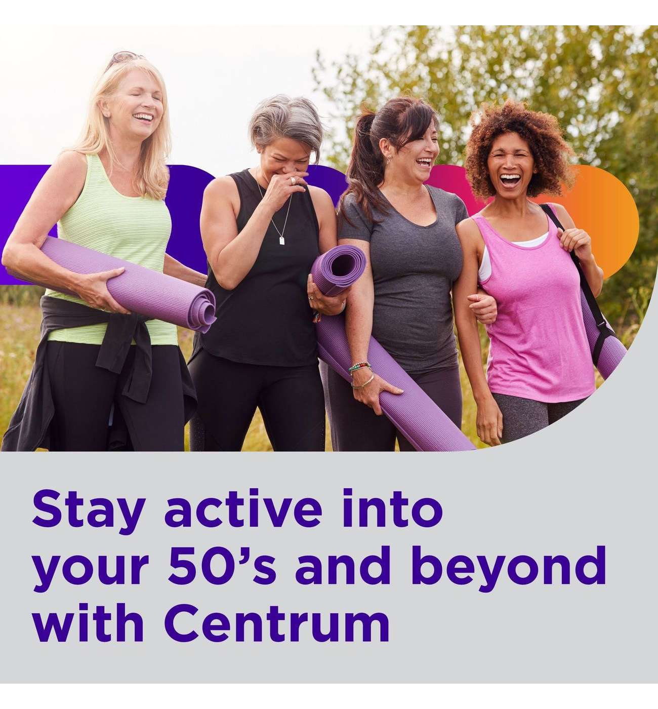 Centrum Silver Women's Multivitamin for Women 50 Plus brings you a tailored multivitamin/multimineral supplement that contains micronutrients to help support full body wellness (1). This women's vitamin with iron contains essential nutrients, including vitamin D and calcium to support strong bones and B Vitamins to help promote heart health (1, 2). This multivitamin for women over 50 also contains zinc and B Vitamins to help support normal brain function and Vitamins A, C, and E for eye health (1, 2). Key micronutrients in these multivitamins with zinc supplements help fill in nutritional gaps to promote overall wellness and vitality (1). These women's vitamins are verified Non-GMO (3) and gluten free. This women's multivitamin with iron features a smooth coating that makes it easy to swallow. Simply take one multivitamin daily to provide your body with essential vitamins and minerals. Help support full body wellness (1) with Centrum multivitamins for seniors, the #1 doctor and pharmacist recommended brand.(1) These statements have not been evaluated by the Food and Drug Administration. This product is not intended to diagnose, treat, cure or prevent any disease.(2) Not a replacement for cholesterol-lowering drugs(3) Non-GMO applies to Centrum and Centrum Silver tablets only; learn more at Centrum's official website ^Haleon does not Sell or Promote GLP-1s. Consult with HCP on GLP-1 and Centrum use. Use as directed.• One 100 count bottle of Centrum Silver Women's Multivitamin for Women 50 Plus, Multivitamin/Multimineral Supplement with Vitamin D3, B Vitamins, Calcium and Antioxidant Vitamins C, E, and Beta-Carotene, and Zinc• Senior multivitamins for women that are clinically shown to support cognitive health in older adults (1)• Supports memory and cognition as you age (1)• Multivitamins for women 50 and over that help support immune health, bone health and muscle function with vitamin D (1)• GLP-1 users: Balance your nutrient needs with Centrum for whole body health^• Women's multivitamins that are Non-GMO and gluten free (1, 3)• Specially formulated women's multivitamins that support the heart, brain, eyes and overall health of women age 50+ (1, 2)• Take one of these multivitamins for women over 50 every day to provide nutrients to support a healthy body (1)