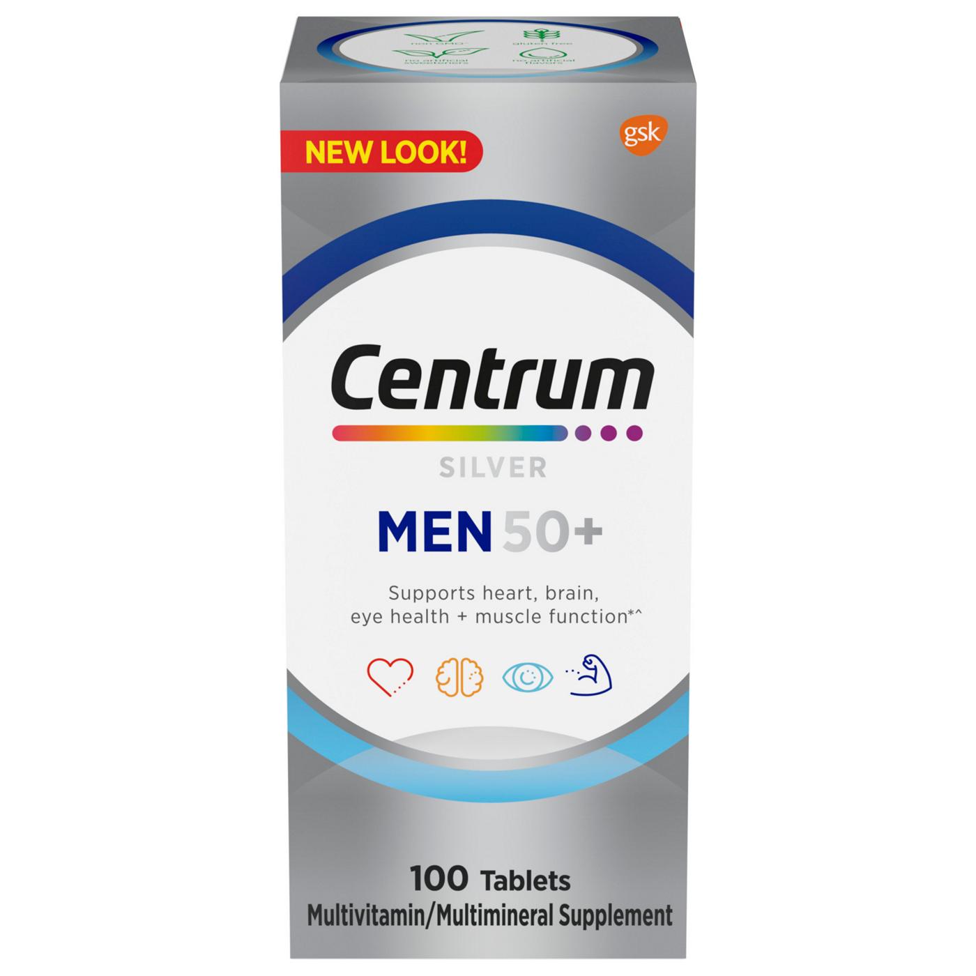 Centrum Silver Multivitamin for Men 50 Plus brings you a tailored multivitamin/multimineral supplement that contains micronutrients to help support full body wellness, complete from A to zinc (1). This daily multivitamin for men over 50 contains essential nutrients, including vitamin D and magnesium to help maintain muscle health, B Vitamins to help promote heart health, zinc and B Vitamins to help support normal brain function, lutein and vitamins A, C, and E to support healthy eyes (1, 2, 3). Key micronutrients in these vitamin supplements help fill in nutritional gaps to promote overall wellness and vitality (1). This senior multivitamin for men is a verified Non-GMO (4) and gluten free multivitamin supplement for men to fit a variety of dietary preferences. Centrum Silver men's multivitamin tablets feature a smooth coating that makes these multivitamins for seniors easy to swallow. Simply take one of these senior men's vitamins daily to provide your body with key vitamins and minerals. Help support full body wellness (1) with Centrum multivitamins, the #1 doctor and pharmacist recommended brand.(1) These statements have not been evaluated by the Food and Drug Administration. This product is not intended to diagnose, treat, cure or prevent any disease.(2) Not a replacement for cholesterol-lowering drugs(3) This product is not intended to provide daily intake of lutein. Take with a diet rich in fruits and vegetables(4) Non-GMO applies to Centrum and Centrum Silver tablets only; learn more at Centrum's official website ^Haleon does not Sell or Promote GLP-1s. Consult with HCP on GLP-1 and Centrum use. Use as directed.• One 100 count bottle of Centrum Silver Multivitamin for Men 50 Plus, Multivitamin/Multimineral Supplement with Vitamin D3, B Vitamins and Zinc• Centrum Silver is the number 1 Doctor recommended multivitamin brand now shown to support memory and cognition in older adults (1)• Supports memory and cognition as you age (1)• Senior multivitamins for men 50 and over that help support immune health, and has Vitamin D to help support bone health and muscle function (1)• GLP-1 users: Balance your nutrient needs with Centrum for whole body health^• Vitamins for eye health and zinc supplements that are Non-GMO and are gluten free (1, 3, 4)• A multivitamin for men over 50 that is an ideal supplement for eye health, heart health, and brain health (1, 2)• Take one of these vitamins for men over 50 every day to provide nutrients to help support a healthy body (1)