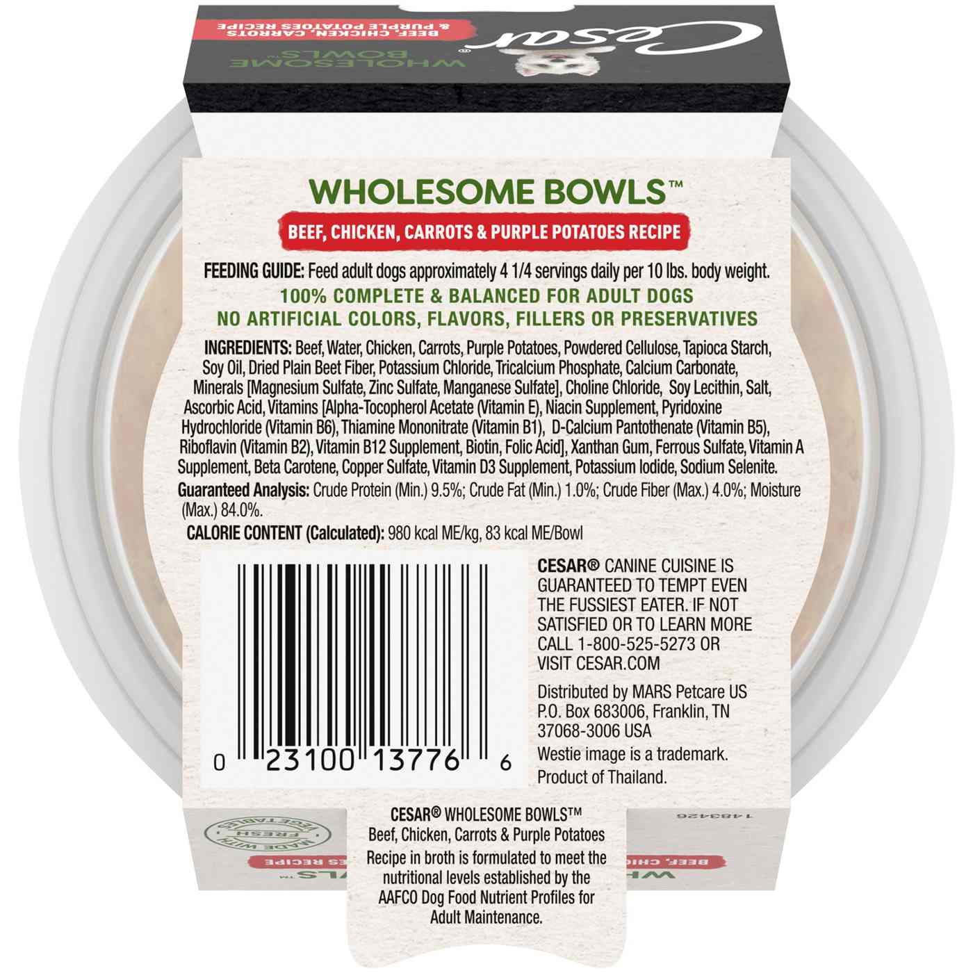 The CESAR brand knows the best way to show your dog love is by keeping them happy and healthy with gourmet meals and complements. CESAR WHOLESOME BOWLS Adult Wet Dog Food, Beef, Chicken, Purple Potatoes & Carrots is full of flavor that will delight your best friend. This product can be served as a meal or a special treat on top of their favorite dry kibble. Real shredded beef and chicken are the #1 ingredients and provides complete and balanced nutrition for adult dogs. There are no artificial colors, flavors, fillers, or preservatives. (*Trace amounts may be present due to potential cross-contact during manufacturing.) CESAR WHOLESOME BOWLS Beef, Chicken, Purple Potatoes & Carrots Recipe is formulated to meet the nutritional levels established by the AAFCO dog nutrient profiles for maintenance. Each bowl contains nine key ingredients or less with added vitamins and minerals. Give your dog a healthy meal or complement they’ll love and love you for.Make Mealtime Delicious: Real shredded beef and chicken are the #1 ingredients which your dog will loveQuality Ingredients: Complete and balanced nutrition served as a meal or a special treat on top of their favorite dry kibbleGreat For Adult Dogs: No artificial colors, flavors, fillers, or preservatives. (*Trace amounts may be present due to potential cross-contact during manufacturing)Delicious Flavors: 9 key ingredients or less with added vitamins and minerals10-Pack: Contains ten (10) 3 oz. packs of CESAR WHOLESOME BOWLS Beef, Chicken, Purple Potatoes & Carrots Recipe Adult Wet Dog Food
