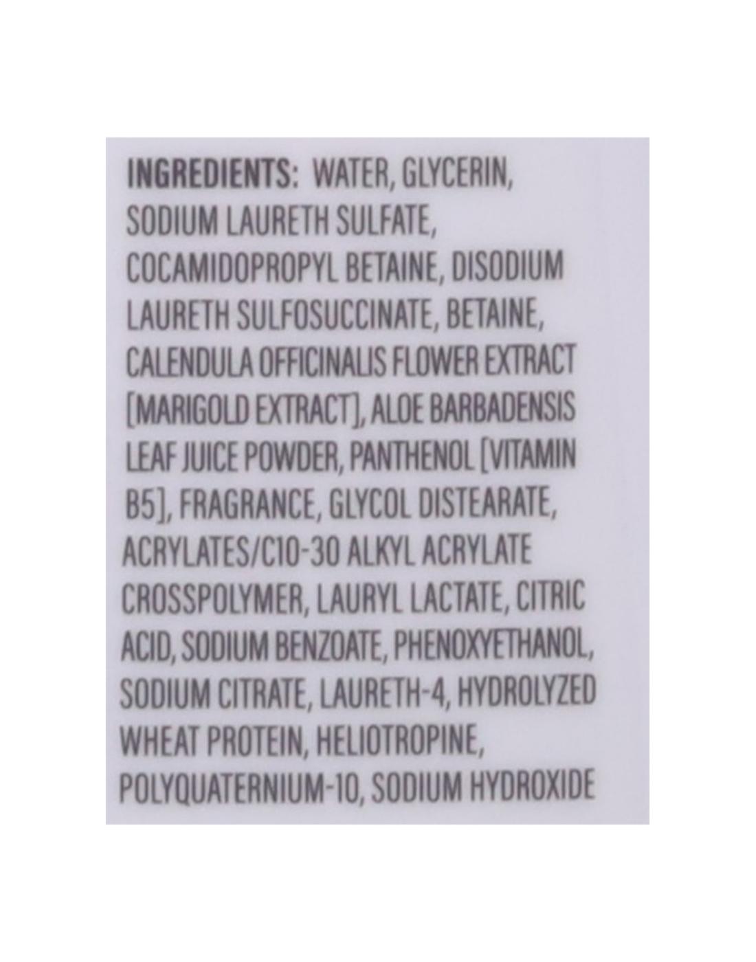 Water, Glycerin, Sodium Laureth Sulfate, Cocamidopropyl Betaine, Disodium Laureth Sulfosuccinate, Betaine, Calendula Officinalis Flower Extract [Marigold Extract], Aloe Barbadensis Leaf Juice Powder, Panthenol [Vitamin B5], Fragrance, Glycol Distearate, Acrylates/C10-30 Alkyl Acrylate Crosspolymer, Lauryl Lactate, Citric Acid, Sodium Benzoate, Phenoxyethanol, Sodium Citrate, Laureth-4, Hydrolyzed Wheat Protein, Heliotropine, Polyquaternium-10, Sodium Hydroxide.