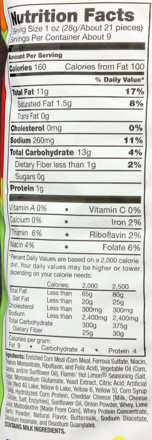 ENRICHED CORN MEAL (CORN MEAL, FERROUS SULFATE, NIACIN, THIAMIN MONONITRATE, RIBOFLAVIN, FOLIC ACID), VEGETABLE OIL (CORN, CANOLA, AND/OR SUNFLOWER OIL), SALT, YEAST EXTRACT, MONOSODIUM GLUTAMATE, POTASSIUM SALT, CITRIC ACID, MALTODEXTRIN (MADE FROM CORN), ARTIFICIAL COLOR (RED 40 LAKE, YELLOW 6 LAKE, YELLOW 6, YELLOW 5), CORN SYRUP SOLIDS, HYDROLYZED CORN PROTEIN, CHEDDAR CHEESE (MILK, CHEESE CULTURES, SALT, ENZYMES), ONION POWDER, SUGAR, WHEY, LIME JUICE, WHEY PROTEIN CONCENTRATE, GARLIC POWDER, NATURAL FLAVORS, BUTTERMILK, SODIUM DIACETATE, DISODIUM INOSINATE, AND DISODIUM GUANYLATE.