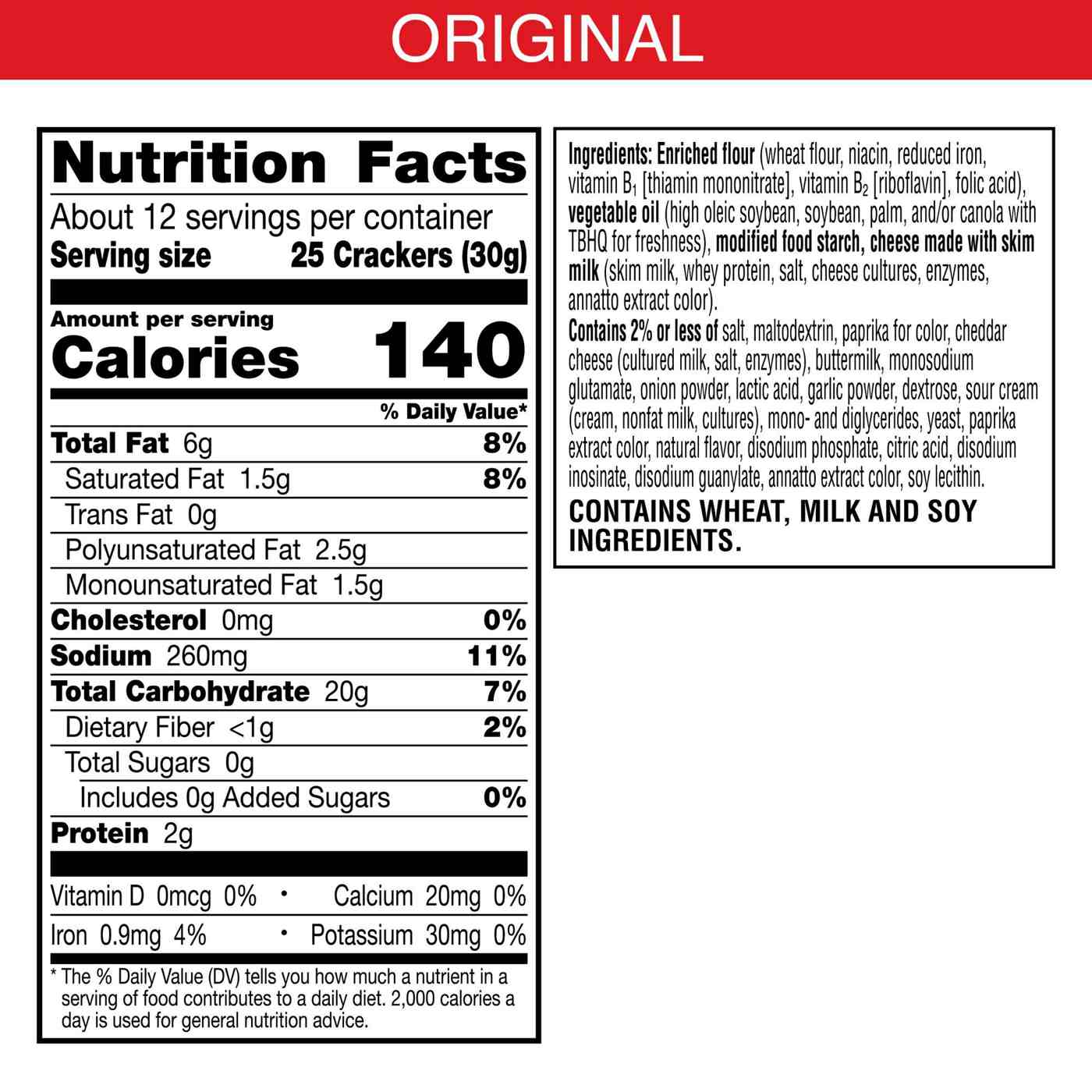 Enriched Flour (Wheat Flour, Niacin, Reduced Iron, Vitamin B1 [Thiamin Mononitrate], Vitamin B2 [Riboflavin], Folic Acid), Vegetable Oil (High Oleic Soybean, Soybean, Palm, And/Or Canola With Tbhq For Freshness), Modified Food Starch, Cheese Made With Skim Milk (Skim Milk, Whey Protein, Salt, Cheese Cultures, Enzymes, Annatto Extract Color). Contains 2% Or Less Of Salt, Maltodextrin, Paprika For Color, Cheddar Cheese (Cultured Milk, Salt, Enzymes), Buttermilk, Monosodium Glutamate, Onion Powder, Lactic Acid, Garlic Powder, Dextrose, Sour Cream (Cream, Nonfat Milk, Cultures), Mono- And Diglycerides, Yeast, Paprika Extract Color, Natural Flavor, Disodium Phosphate, Citric Acid, Disodium Inosinate, Disodium Guanylate, Annatto Extract Color, Soy Lecithin.Allergens and safety warnings