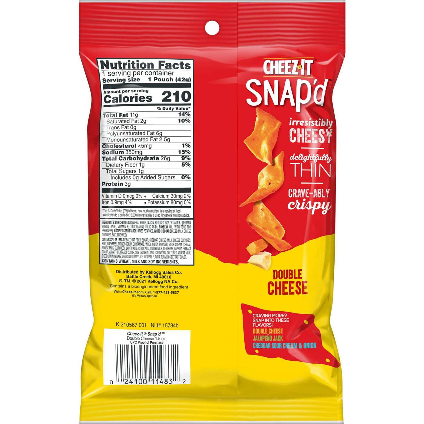 Make snack time more fun with Cheez-It Snap'd Double Cheese - the super thin and crispy cheesy baked snacks loaded with big cheese flavor. With 100% real cheese baked-in and sprinkled on top, Cheez-It Snap'd crackers are irresistibly cheesy. The Snap'd snacks are delightfully thin with a crispy snap for extra crunch in every bite. Cheez-It Snap'd snacks are perfect for celebrating game time, make a great addition to party spreads, cure late-night savory cravings and more - the cheesy options are endless. Pack your Snap'd snacks in school lunches or as an extra snack on-the-go. With double the cheesy zest for double the flavor and double the fun, this snack will tempt you with, ‘just one more bite.' You'll love the bold crunch and delicious, tasty flavor of real cheese in every perfectly-baked bite of Cheez-It Snap'd Double Cheese Cheesy Baked Snacks.