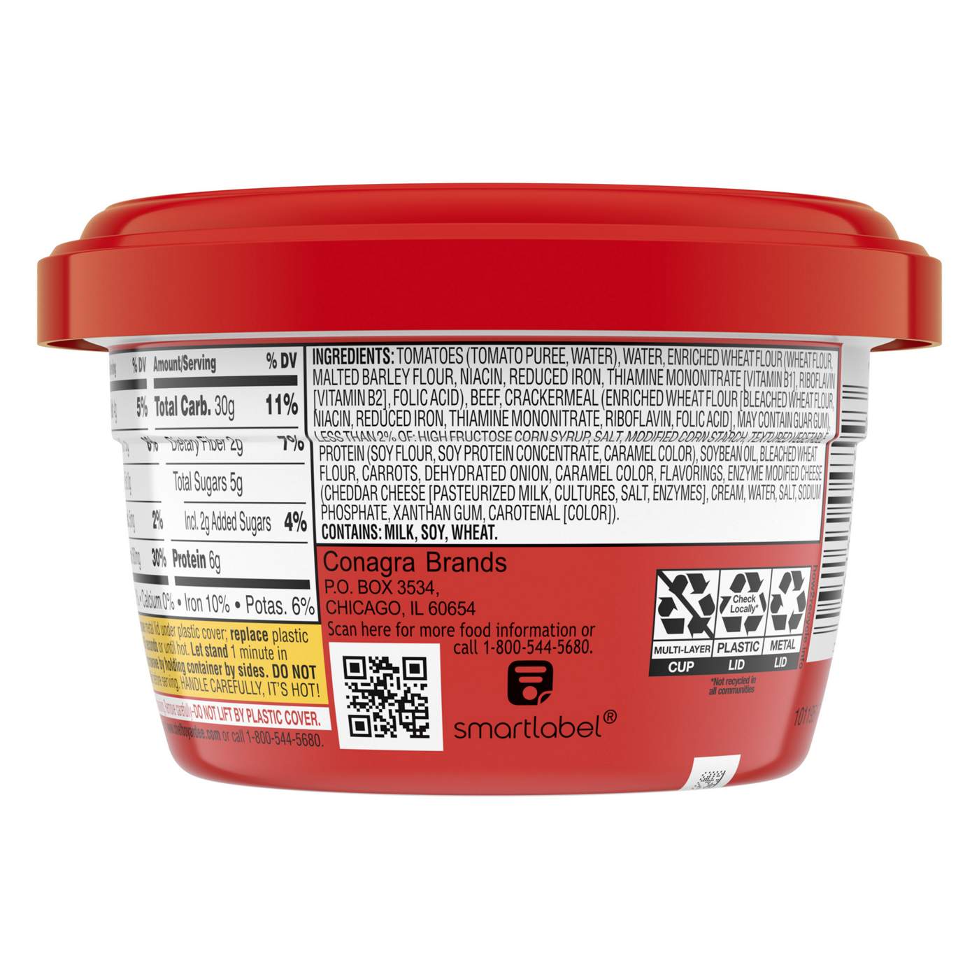 Tomatoes (Tomato Puree, Water), Water, Enriched Wheat Flour (Wheat Flour, Malted Barley Flour, Niacin, Reduced Iron, Thiamine Mononitrate [Vitamin B1], Riboflavin [Vitamin B2], Folic Acid), Beef, Crackermeal (Enriched Wheat Flour [Bleached Wheat Flour, Niacin, Reduced Iron, Thiamine Mononitrate, Riboflavin, Folic Acid], May Contain Guar Gum), Less than 2% of: High Fructose Corn Syrup, Salt, Modified Corn Starch, Textured Vegetable Protein (Soy Flour, Soy Protein Concentrate, Caramel Color), Soybean Oil, Bleached Wheat Flour, Carrots, Dehydrated Onion, Caramel Color, Flavorings, Enzyme Modified Cheese (Cheddar Cheese [Pasteurized Milk, Cultures, Salt, Enzymes], Cream, Water, Salt, Sodium Phosphate, Xanthan Gum, Carotenal [Color]).Allergens and safety warnings