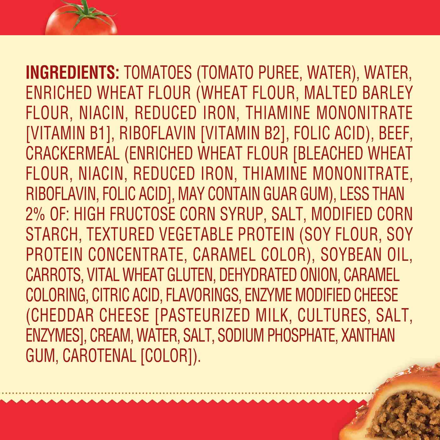 Tomatoes (Tomato Puree, Water), Water, Enriched Wheat Flour (Wheat Flour, Malted Barley Flour, Niacin, Reduced Iron, Thiamine Mononitrate [Vitamin B1], Riboflavin [Vitamin B2], Folic Acid), Beef, Crackermeal (Enriched Wheat Flour [Bleached Wheat Flour, Niacin, Reduced Iron, Thiamine Mononitrate, Riboflavin, Folic Acid], May Contain Guar Gum), Less than 2% of: High Fructose Corn Syrup, Salt, Modified Corn Starch, Soybean Oil, Carrots, Textured Vegetable Protein (Soy Flour, Soy Protein Concentrate, Caramel Color), Wheat Gluten, Dehydrated Onion, Caramel Color, Citric Acid, Flavoring, Enzyme Modified Cheese (Cheddar Cheese [Pasteurized Milk, Cultures, Salt, Enzymes], Cream, Water, Salt, Sodium Phosphate, Xanthan Gum, Carotenal [Color]).Allergens and safety warnings