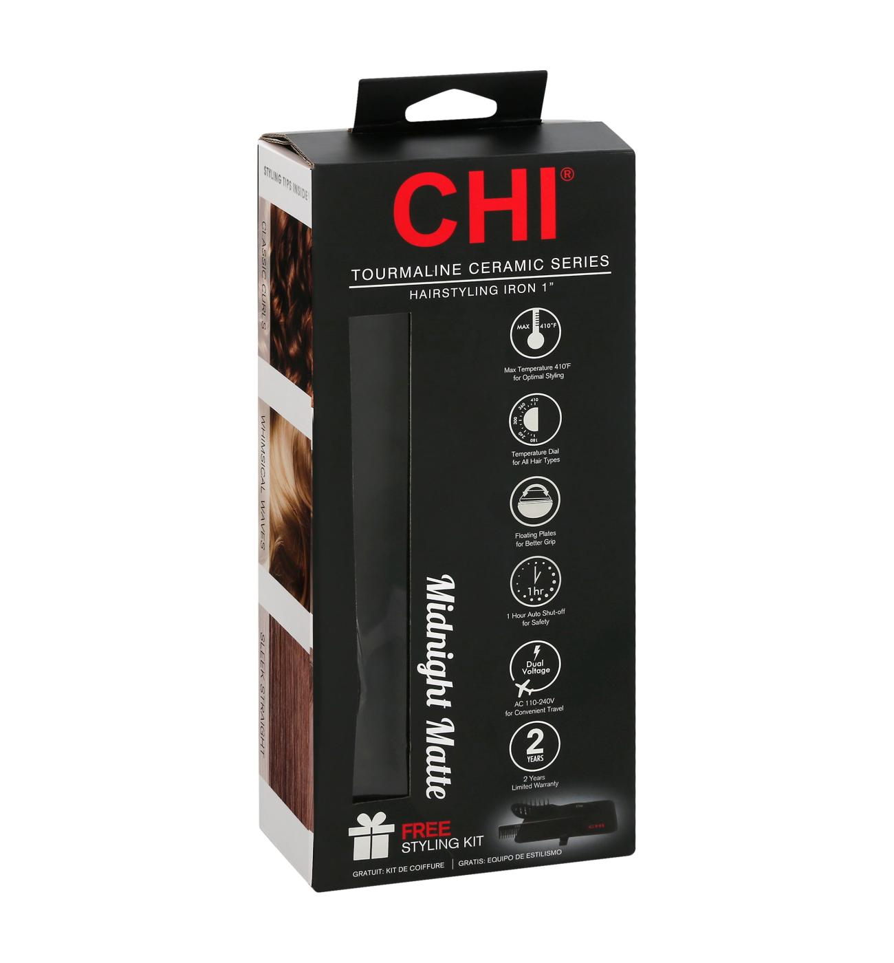 This CHI hairstyling iron is designed to help you create sleek, straight hairstyles. It features 1-inch ceramic plates for even heat and a smooth glide through your hair. The iron's unique Midnight Matte finish gives it a modern and sophisticated look.• Features a digital temperature display for precise heat control• 1-inch ceramic plates provide consistent heat and a smooth glide• The unique matte finish offers a comfortable, non-slip grip• Ideal for creating sleek, straight styles while minimizing frizz