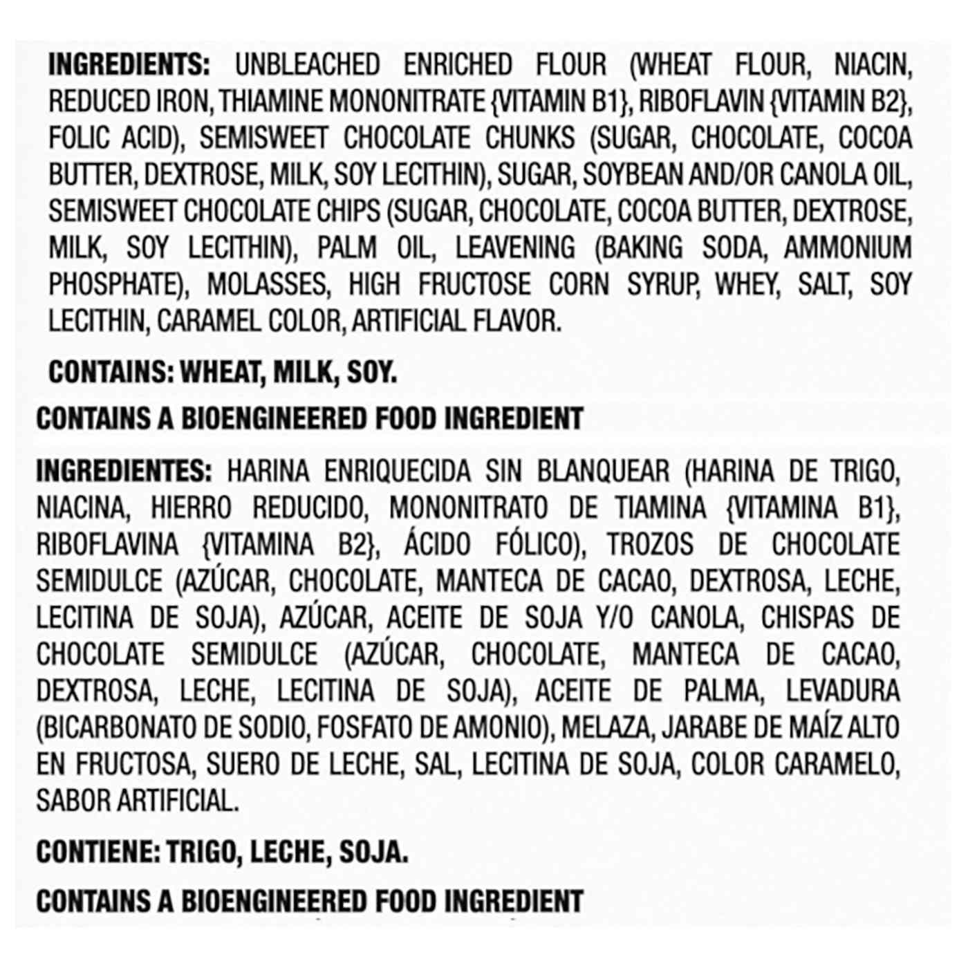 Unbleached Enriched Flour (Wheat Flour, Niacin, Reduced Iron, Thiamine Mononitrate [Vitamin B1], Riboflavin [Vitamin B2], Folic Acid), Fudge Chunks (Sugar, Hydrogenated Vegetable Oil [Palm Kernel And/Or Palm Oil], Cocoa [Processed With Alkali], Dextrose, Soy Lecithin, Artificial Flavor, Nonfat Milk), Sugar, Soybean And/Or Canola Oil, Fudge Chips (Sugar, Hydrogenated Vegetable Oil [Palm Kernel And/Or Palm Oil], Cocoa [Processed With Alkali], Dextrose, Soy Lecithin, Artificial Flavor, Nonfat Milk), Palm Oil, Leavening (Baking Soda, Ammonium Phosphate), Molasses, High Fructose Corn Syrup, Whey, Salt, Soy Lecithin, Artificial Flavor, Caramel Color. Contains: Milk, Wheat, Soy.Allergens and safety warnings