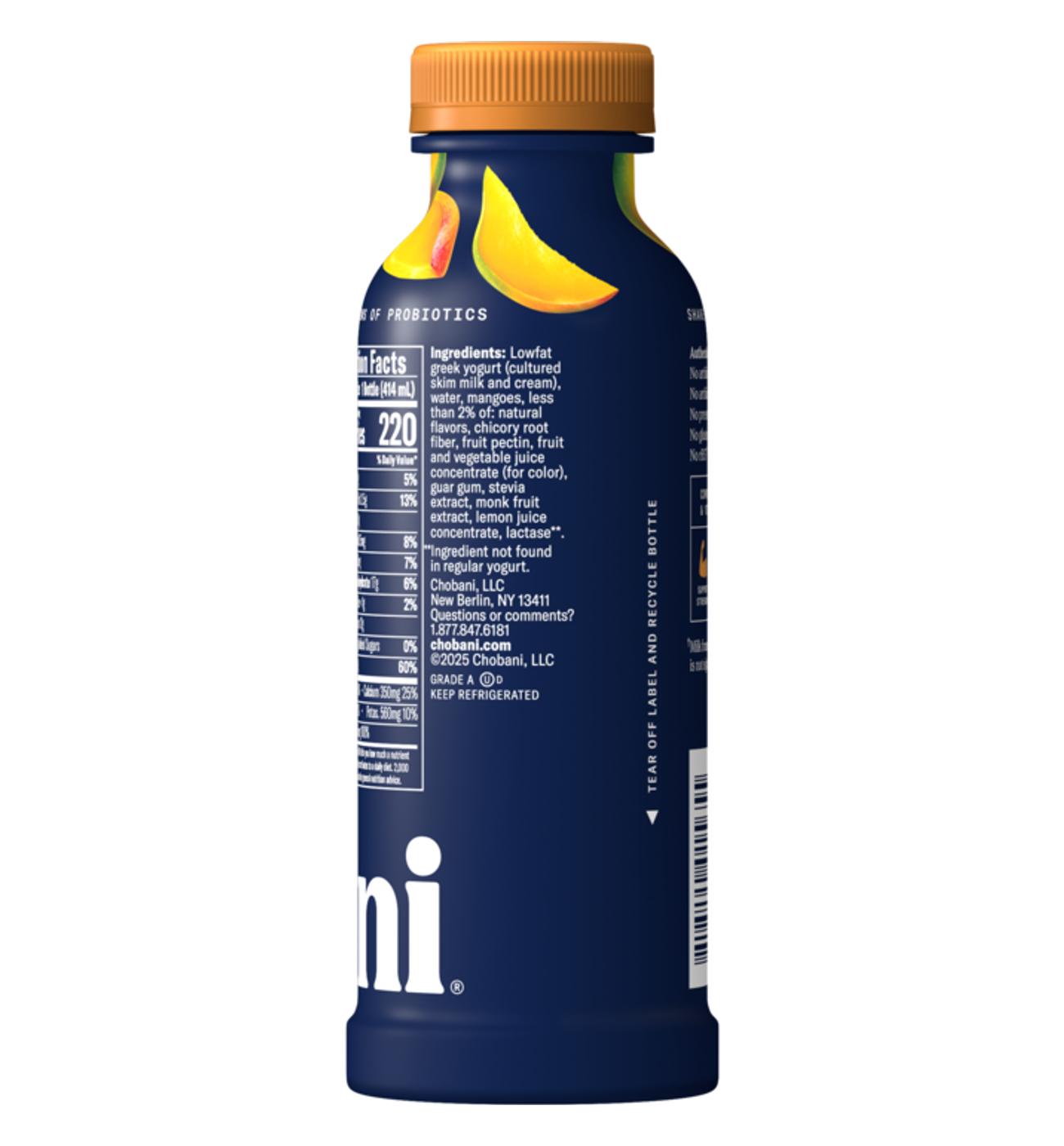 Lowfat Greek Yogurt (Cultured Skim Milk and Cream), Water, Mangoes, Less than 2% of: Natural Flavors, Chicory Root Fiber, Fruit Pectin, Fruit and Vegetable Juice Concentrate (for Color), Guar Gum, Stevia Extract, Monk Fruit Extract, Lemon Juice Concentrate, Lactase**. **Ingredient Not Found in Regular Yogurt.