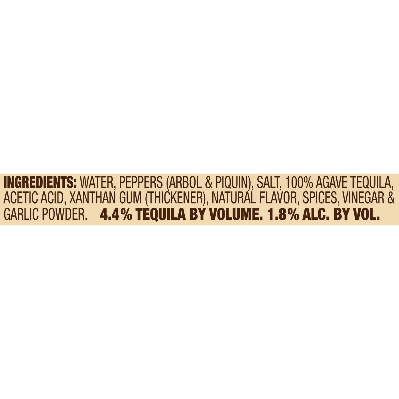 Water, Peppers (Arbol & Piquin), Salt, 100% Agave Tequila, Acetic Acid, Xanthan Gum (Thickener), Natural Flavor, Spices, Vinegar & Garlic Powder. 4.4 % Tequila By Volume. 1.8 % Alc. By Vol.