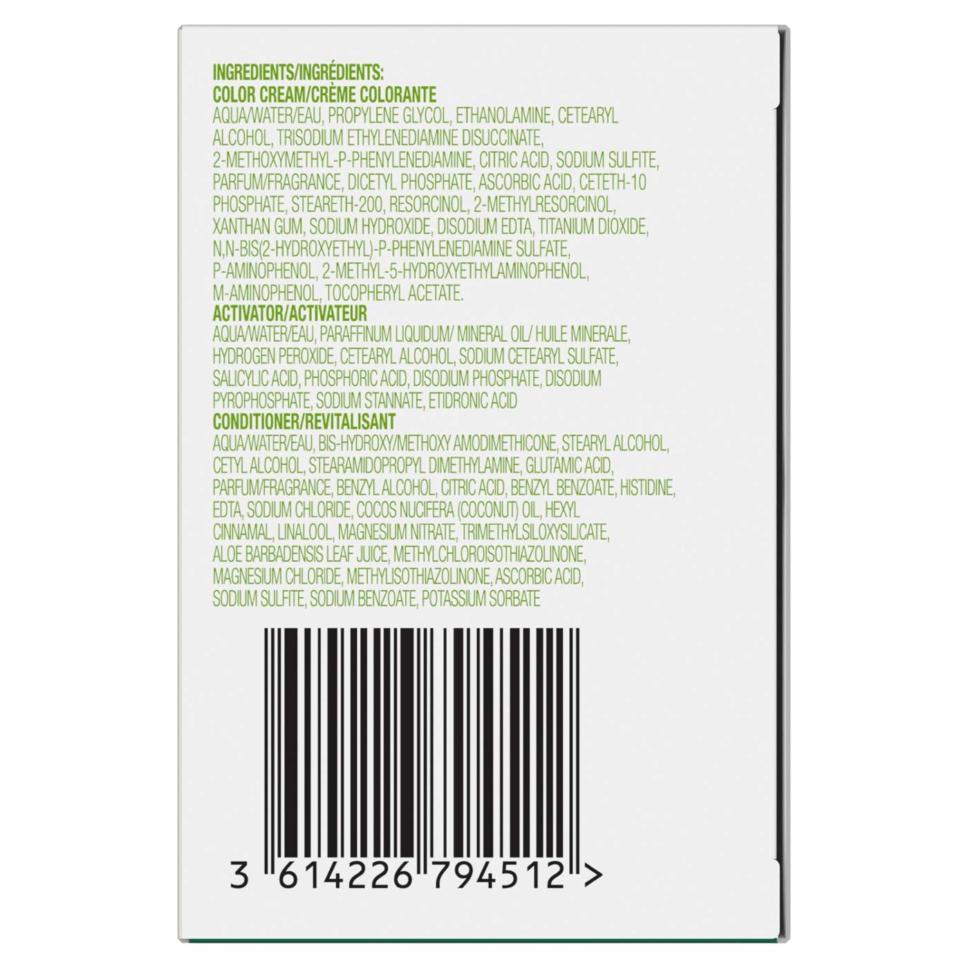 Color Cream Aqua/Water/Eau, Propylene Glycol, Ethanolamine, 2-Methoxymethyl-P-Phenylenediamine, Cetearyl Alcohol, Trisodium Ethylenediamine Disuccinate, Resorcinol, 2-Methylresorcinol, Citric Acid, Parfum/Fragrance, Sodium Sulfite, Dicetyl Phosphate, Ascorbic Acid, Ceteth-10 Phosphate, Steareth-200, Xanthan Gum, M-Aminophenol, Sodium Hydroxide, Titanium Dioxide/(CI 77891), Disodium EDTA, 4-Amino-2-Hydroxytoluene, Tocopheryl Acetate, Hydroxyethyl-3.4-Methylenedioxyaniline HCl, Color Activator Aqua/Water/Eau, Paraffinum Liquidum/Mineral Oil/Huile Minerale, Hydrogen Peroxide, Cetearyl Alcohol, Sodium Cetearyl Sulfate, Salicylic Acid, Phosphoric Acid, Disodium Phosphate, Disodium Pyrophosphate, Sodium Stannate, Etidronic Acid, Brilliant Shine Conditioner Aqua/Water/Eau, Bis-Hydroxy/Methoxy Amodimethicone, Stearyl Alcohol, Cetyl Alcohol, Stearamidopropyl Dimethylamine, Glutamic Acid, Parfum/Fragrance, Benzyl Alcohol, Citric Acid, Benzyl Benzoate, EDTA, Histidine, Cocos Nucifera (Coconut) Oil, Sodium Chloride, Hexyl Cinnamal, Linalool, Magnesium Nitrate, Trimethylsiloxysilicate, Aloe Barbadensis Leaf Juice, Methylchloroisothiazolinone, Magnesium Chloride, Methylisothiazolinone, BHT, Ascorbic Acid, Potassium Sorbate, Sodium Benzoate, Sodium Sulfite.Allergens and safety warnings