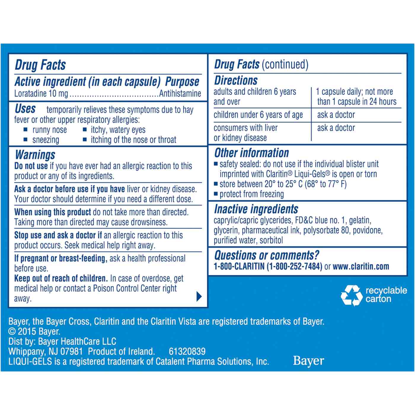In Each Capsule: Active Ingredients: Loratadine (10 mg), Antihistamine. Inactive Ingredients: Caprylic/Capric Glycerides, FD&C Blue 1, Gelatin, Glycerin, Pharmaceutical Ink, Polysorbate 80, Povidone, Purified Water, Sorbitol.Allergens and safety warnings