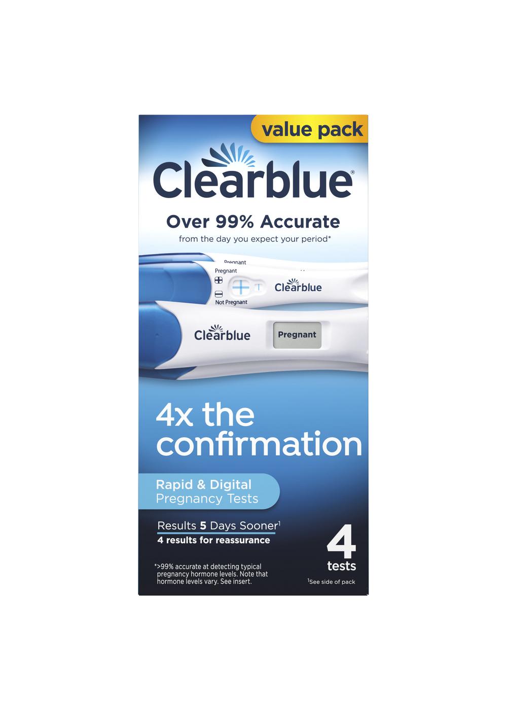 This unique Clearblue Pregnancy Test Combo Pack includes 2 different tests - bringing you extra value and peace of mind. The Clearblue Digital Pregnancy Test provides unmistakably clear results in words. The Clearblue Rapid Detection Pregnancy Test has a color change tip and provides fast results with a clear plus (+) or minus (-) result within 3 minutes. With 2 ways to test, you will have 2 ways to know and you can double-check your result. Both tests are over 99% accurate from the day of your expected period[1] and are so sensitive you can use them up to 5 days sooner than your missed period[2].