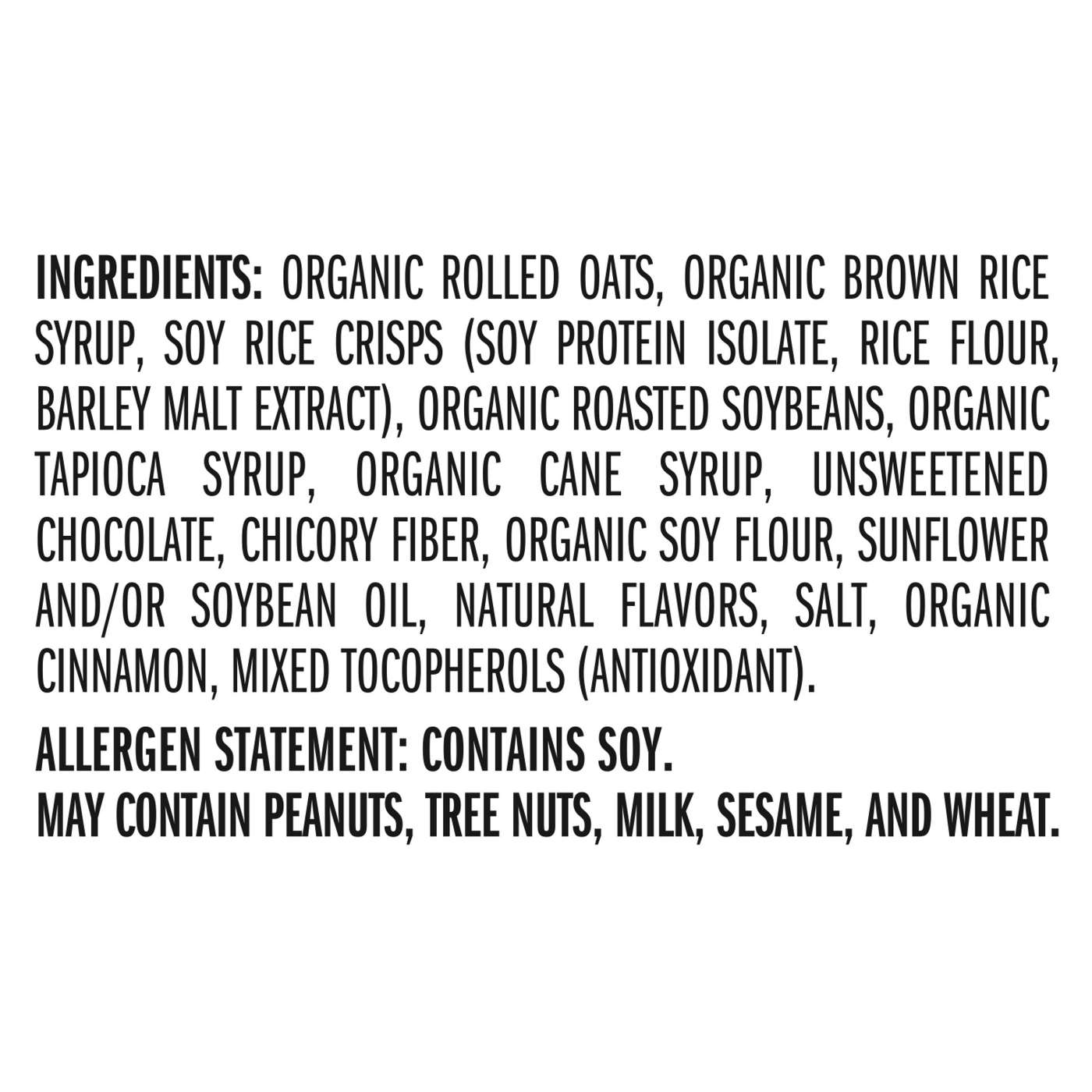 Organic Rolled Oats, Organic Brown Rice Syrup, Soy Rice Crisps (Soy Protein Isolate, Rice Flour, Barley Malt Extract), Organic Roasted Soybeans, Organic Tapioca Syrup, Organic Cane Syrup, Unsweetened Chocolate, Chicory Fiber, Organic Soy Flour, Sunflower And/Or Soybean Oil, Natural Flavors, Salt, Organic Cinnamon, Mixed Tocopherols (Antioxidant).Allergen Statement: Contains Soy. May Contain Peanuts, Tree Nuts, Milk, Sesame, And Wheat.Allergens and safety warnings