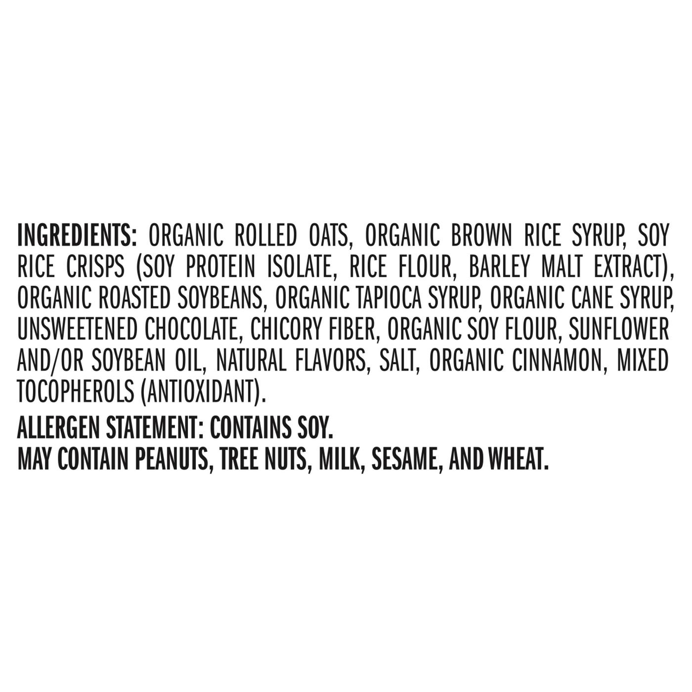 Organic Rolled Oats, Organic Brown Rice Syrup, Soy Rice Crisps (Soy Protein Isolate, Rice Flour, Barley Malt Extract), Organic Roasted Soybeans, Organic Tapioca Syrup, Organic Cane Syrup, Unsweetened Chocolate, Chicory Fiber, Organic Soy Flour, Sunflower And/Or Soybean Oil, Natural Flavors, Salt, Organic Cinnamon, Mixed Tocopherols (Antioxidant).Allergen Statement: Contains Soy. May Contain Peanuts, Tree Nuts, Milk, Sesame, And Wheat.Allergens and safety warnings