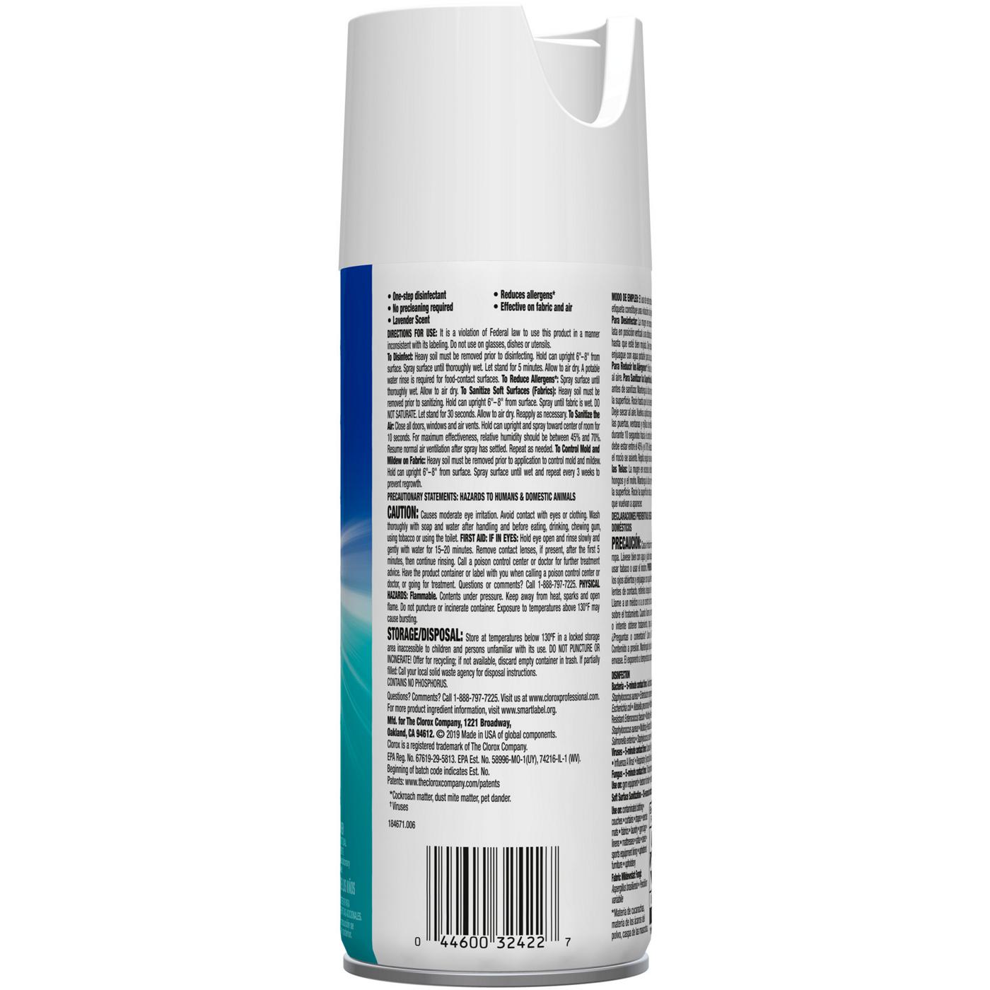 Clorox Fabric Sanitizer Aerosol Spray is a spray-and-go aerosol that kills 99.9% of bacteria on fabrics to freshen up your clothing between washes.- KILLS 99.9% OF BACTERIA: Spray, sanitize and go, no pre-cleaning or post-rinse required with this aerosol spray formulated to kill 99.9% of odor-causing bacteria on soft surfaces in 30 seconds- ONE-STEP SANITIZER: Sanitizes and effectively eliminates odor causing bacteria in clothing and fabrics in 30 seconds, making it ideal when your clothing needs a little refresh in between washes- BLEACH-FREE: Clorox Fabric Sanitizer Spray sanitizes your clothes and fabrics without bleach-free fabric sanitizer while leaving behind a fresh, clean lavender scent- COLOR-SAFE: Safe for use on all colored fabrics, this fabric sanitizer makes it convenient when you are on-the-go and need to rid your favorite clothes of the work-out stench and other everyday odors- POWERFUL CLOROX CLEAN: Sanitize, eliminate odors and keep your garments smelling lavender fresh with this one-step sanitizer that let's you spray and go on with your day