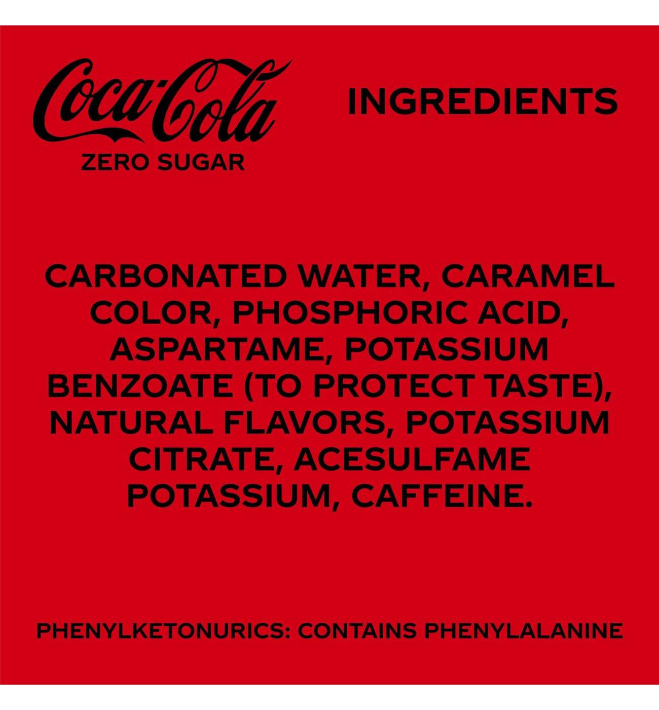There's nothing quite like the crisp, refreshing taste of an ice-cold Coca-Cola Zero Sugar. With this zero sugar soda, you can enjoy the same great Coca-Cola taste, with zero sugar and zero calories. However you choose to enjoy it, this delicious soft drink elevates life's sweetest moments and makes them even better (without the sugar). Delicious and refreshing, Coca-Cola Zero Sugar is meant to be enjoyed anytime, anywhere. This zero-sugar cola's secret formula has been carefully crafted to create a no-sugar taste experience like no other. The familiar fizz and caffeine give you a moment of refreshment with every sip.Pop open a Coca-Cola Zero Sugar to make great taste a part of every day. Whether spending time with friends and family or taking a quick break to recharge, Coke Zero provides the great Coca-Cola taste you love without the sugar. Find your magic and make life delicious with an ice-cold Coca-Cola Zero Sugar!