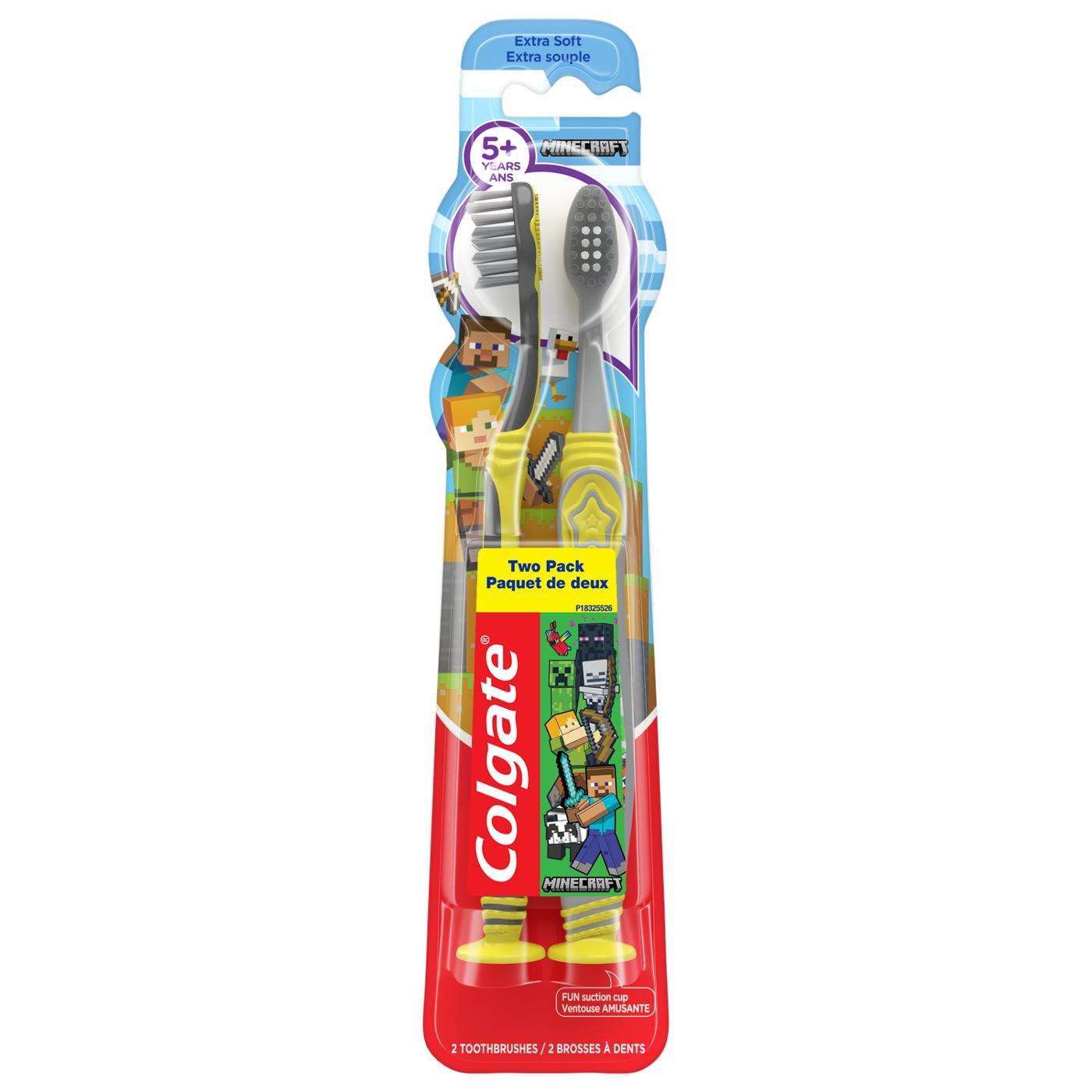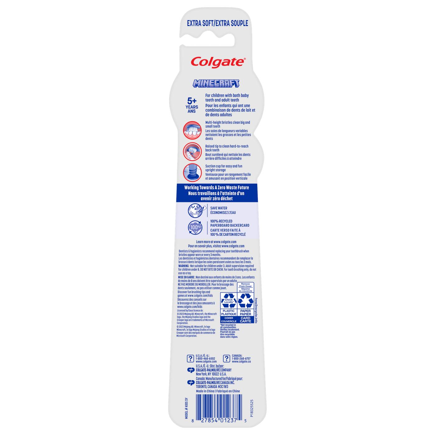 Colgate Kids Minecraft Extra Soft Manual Toothbrush is designed for children 5 years and older. This toothbrush features a small head for easy access to child's mouth and a suction cup for upright storage.
