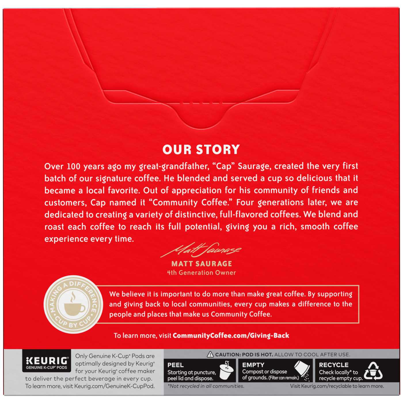 Smooth, flavorful blend with notes of caramel and cocoa. Making a difference cup by cup. Est. 1919. Family owned. Compatible with single-serve brewing systems, including Keurig k-cup brewers. Our Cafe Special blend is designed to highlight coffee beans known for their sweeter profile. After harvesting, the coffee is allowed to dry naturally in the sun, locking in flavor unique to South and Central America. We roast this coffee to a medium-dark color to bring out notes of caramel and cocoa, giving you the taste of your favorite cafe right at home. Our Story: Over 100 years ago my great-grandfather, cap Saurage, created the very first batch of our signature coffee. HE blended and served a cup so delicious that it became a local favorite. Out of appreciation for his community of friends and customers, cap named it Community Coffee. Four generations later, we are dedicated to creating a variety of distinctive, full-flavored coffees.
