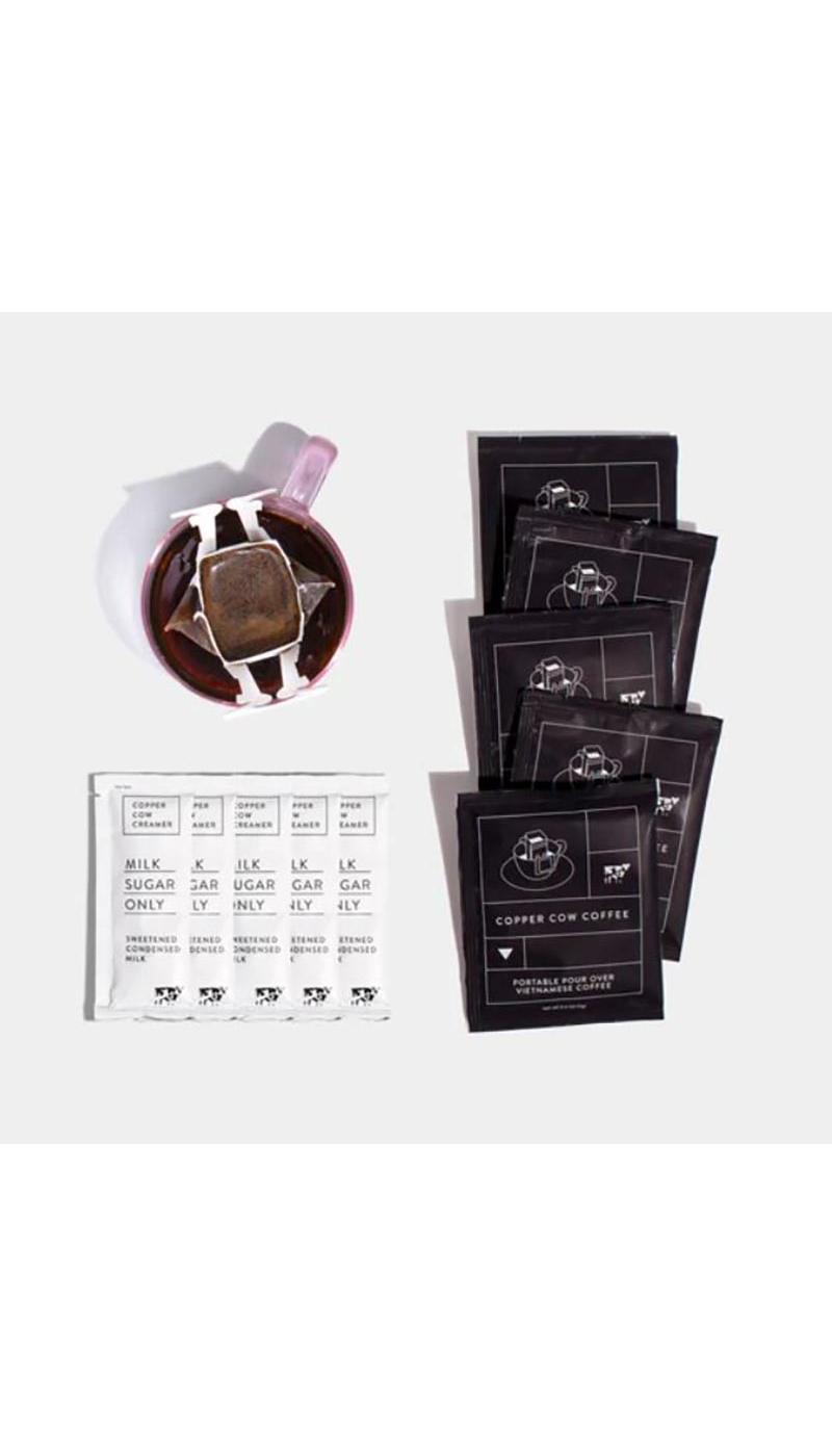 This Copper Cow Coffee pour-over set includes 5 filters for making 5 cups of Vietnamese coffee. There's no additional brewing equipment required — just place a filter over any coffee cup and add hot water for a fresh specialty brew. Top it off with the included sweetened condensed milk for the perfect finishing touch.