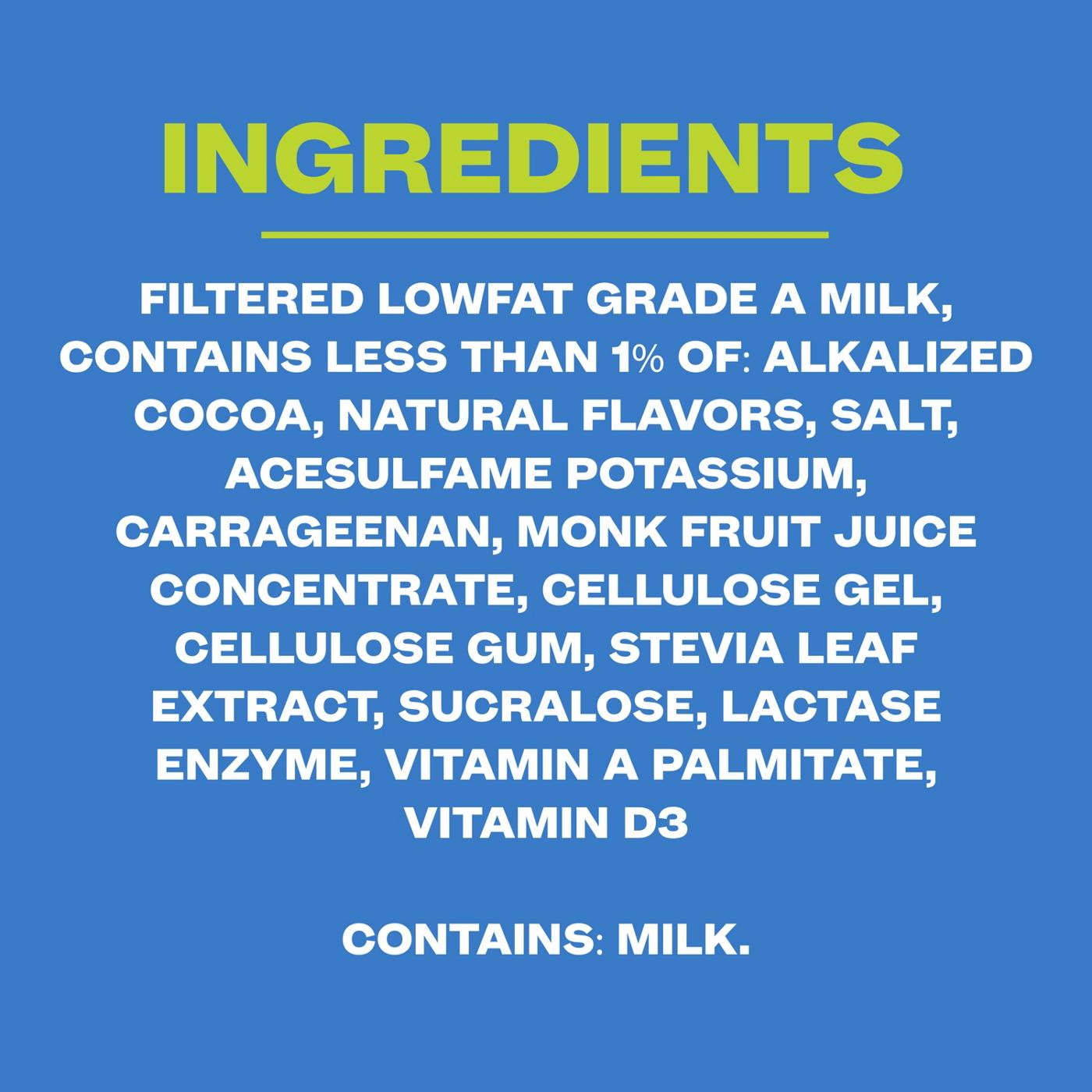 Filtered Lowfat Grade A Milk, Contains Less Than 1% Of: Alkalized Cocoa, Natural Flavors, Salt, Acesulfame Potassium, Carrageenan, Monk Fruit Juice Concentrate, Cellulose Gel, Cellulose Gum, Stevia Leaf Extract, Sucralose, Lactase Enzyme, Vitamin A Palmitate, Vitamin D3.Allergens and safety warnings