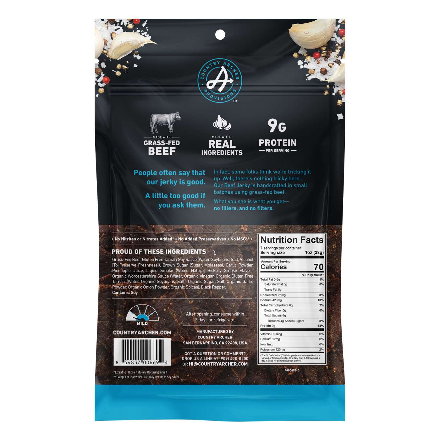 Country Archer Provisions Beef Jerky is handcrafted in small batches using 100% grass-fed beef and real spices for a high protein snack that’s free from the fake stuff, like nitrites, nitrates, and MSG. So whether you're hunting for a low carb beef jerky to be your go-to keto snack or just need a clean, portable source of protein, you’ve found it here. Because with this beef jerky, what you see is what you get – no fillers, and no filters.