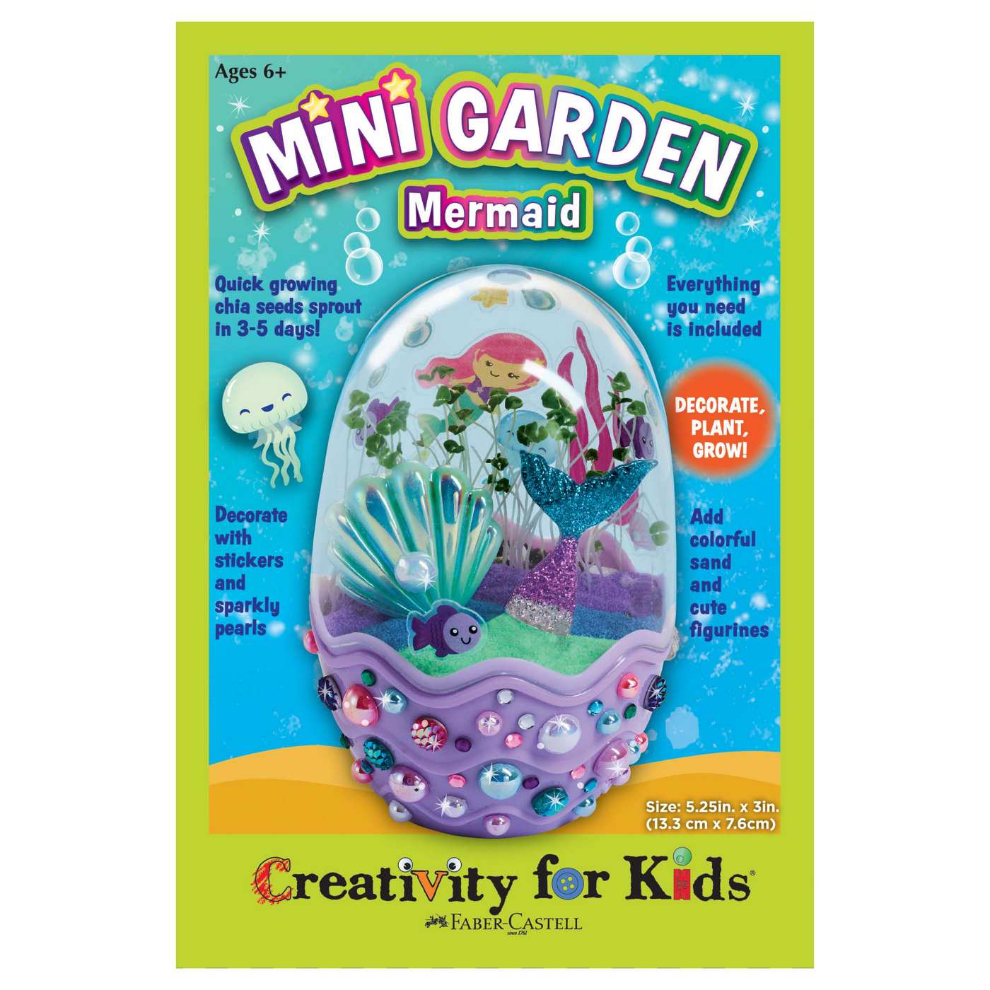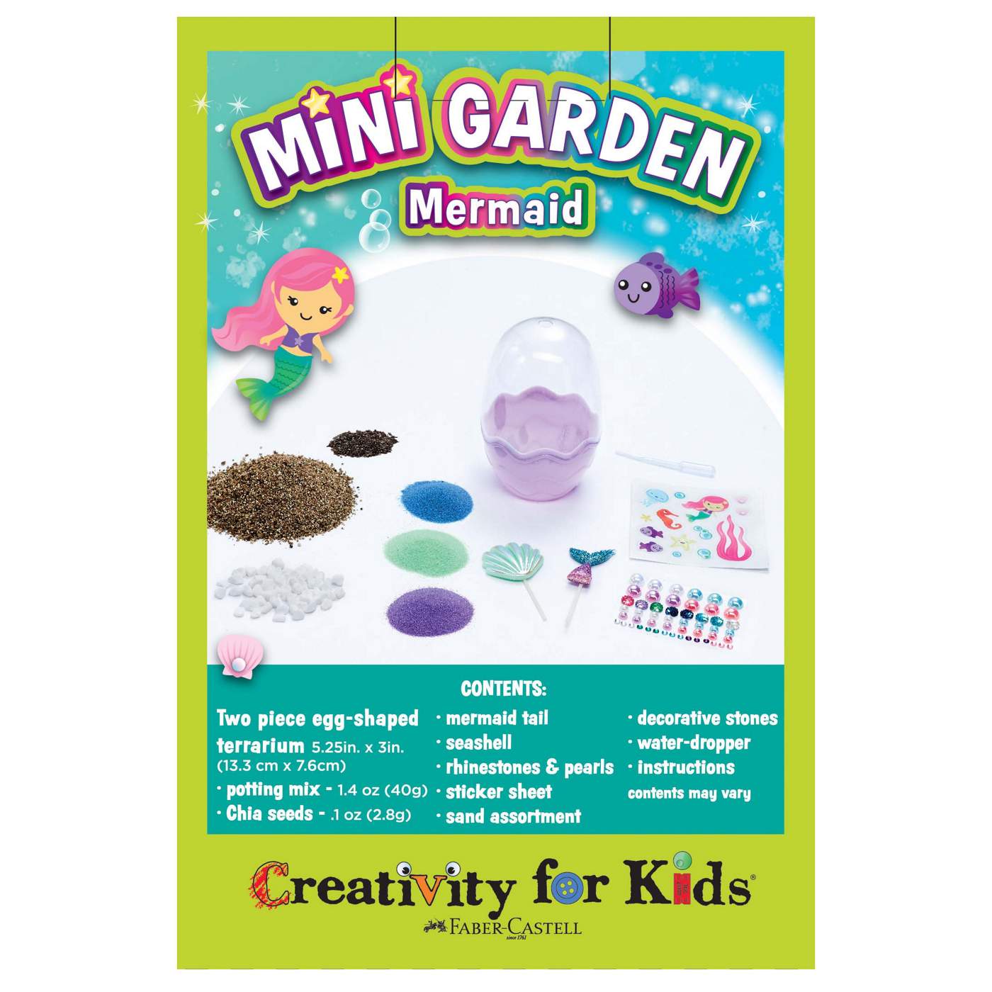 The complete gardening activity and girls toy for ages 6-8 includes potting mix, quick-growing chia seeds, mermaid and underwater-themed stickers, pearl dimensional accents, a fun mini mermaid tail, clamshell, and decorative sand. The potting mix is vermiculite, and all seeds are from and packaged in the USA. Mini mermaid gardens make the perfect holiday stocking stuffer for kids or 7 year old girl gifts. This special craft for kids makes the perfect addition as an Easter Basket Stuffer, mermaid gift for girls, small gift for kids, Spring crafts, rainy day activity and so much more! Creativity for Kids Mermaid Garden girls toys allows for indoor gardening – anytime, making them the ultimate kids gifts. Let creativity and self-expression take the lead as you decorate your mermaid egg garden. Colorful mermaid stickers and accents bring your garden to life and spark curiosity about oceanic life. Growing a mini garden is a special 6 year old girl gift, and an opportunity to develop nurturing skills, responsibility, and creative confidence! Since 1971, Creativity for Kids has proudly created unique craft experiences for children to create, explore and build creative confidence for life. This mermaid gardening kit for kids features non-toxic materials that are kid-friendly and recommended for ages 6-8+. For best results, do not put your terrarium in direct sunlight. Completed mermaid garden measures 5.25” H X 3” w.
