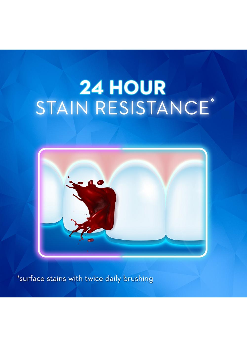 Crest 3D White Brilliance Toothpaste whitens teeth by removing 100% more surface stains in 3 days (vs. regular toothpaste). This Crest 3D White toothpaste has 24-hour stain protection when paired with twice-daily brushing. The brilliance toothpaste formula contains fluoride that helps fight cavities while whitening teeth by micro-cleansing each tooth and removing surface stains.