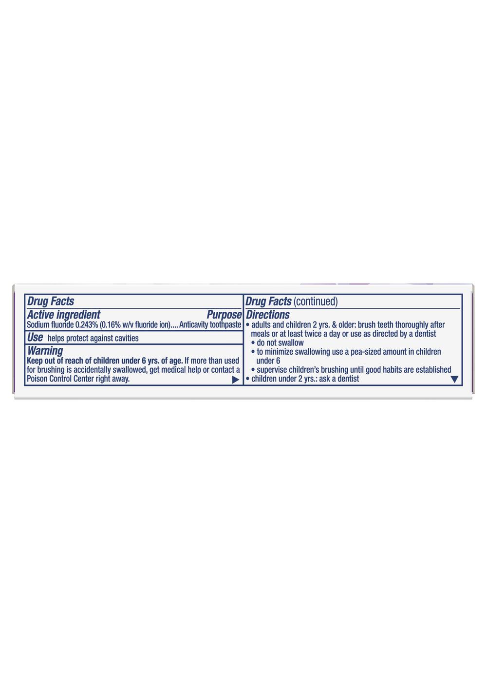 ACTIVE INGREDIENTS: SODIUM FLUORIDE (0.16% W/V FLUORIDE ION) (0.243 %), ANTICAVITY TOOTHPASTE. INACTIVE INGREDIENTS: GLYCERIN, HYDRATED SILICA, SODIUM HEXAMETAPHOSPHATE, WATER, PEG-6, FLAVOR, SODIUM LAURYL SULFATE, COCAMIDOPROPYL BETAINE, TRISODIUM PHOSPHATE, SODIUM SACCHARIN, PVP, CARRAGEENAN, XANTHAN GUM, SUCRALOSE, MICA, TITANIUM DIOXIDE.Allergens and safety warnings