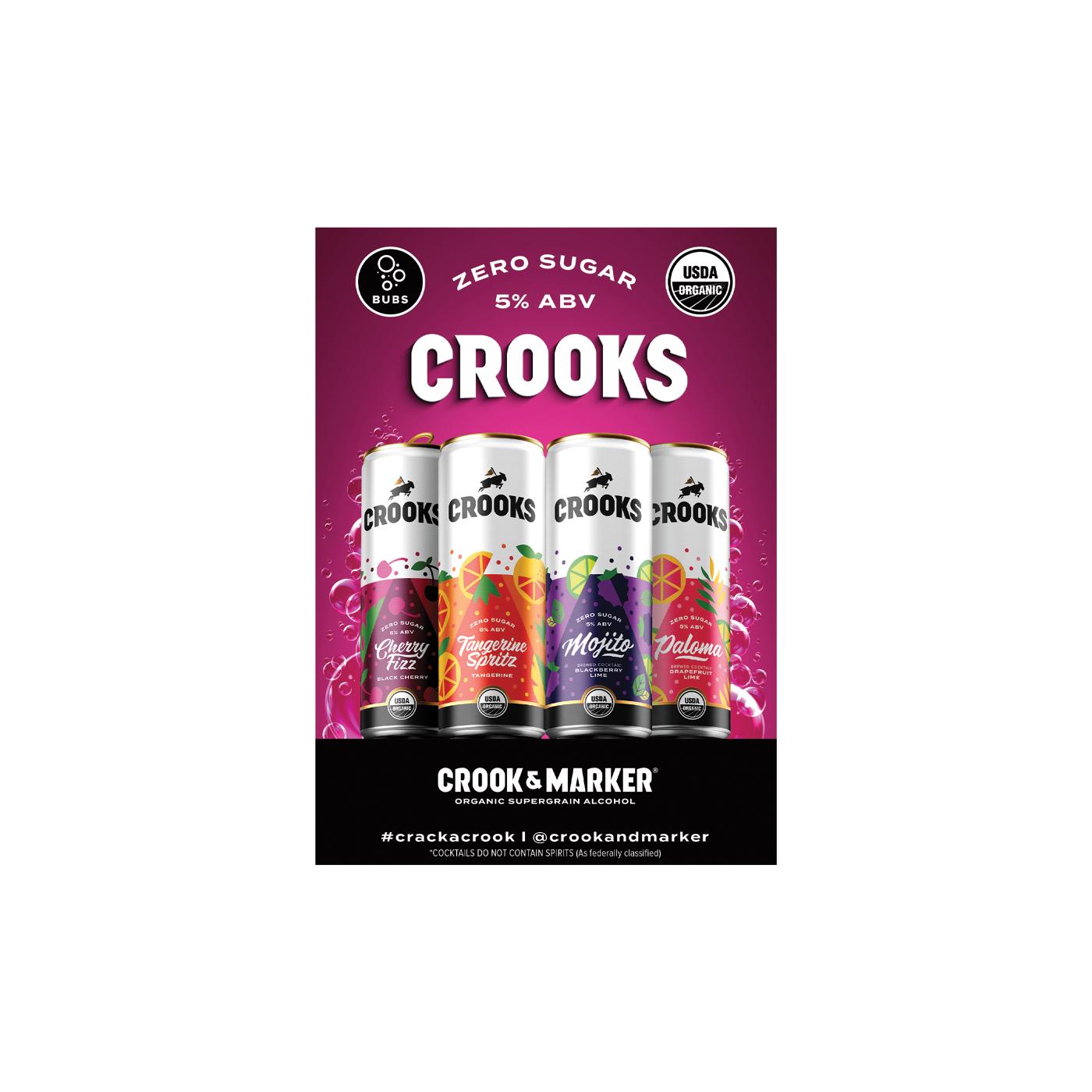 Designed for those who love variety, Crooks Bubbles Variety Pack is perfect for poolside sipping and nights out with friends for a flavorful escape. Crooks brings bold fruit flavor for every occasion. Elevate your drinking experience with Crooks Bubbles – including Cherry Fizz, Blackberry Lime Mojito, Grapefruit Lime Paloma, and Tangerine Spritz.
