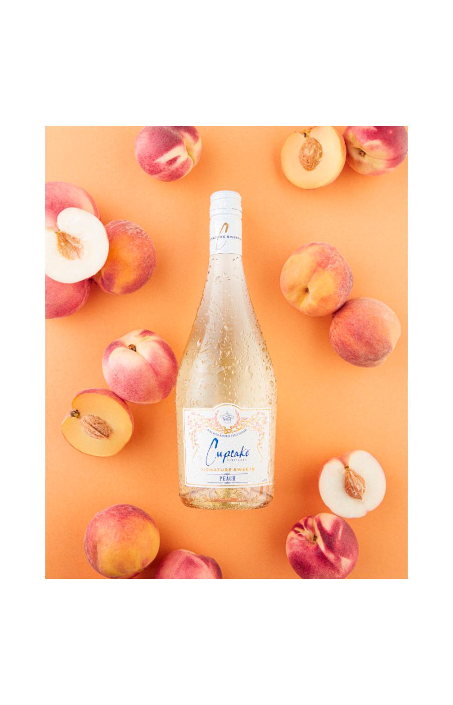 Cupcake Vineyards Signature Sweets Peach Moscato White Wine is sourced from California. This delightful white wine is refreshingly sweet and effervescent with notes of nectarine, peach rings, and wildflowers. It contains 5.5% alcohol by volume. Enjoy it chilled, perfectly paired with vanilla gelato for an unforgettable taste experience. This wine is ideal for casual gatherings or to elevate daily moments with a touch of sweetness.